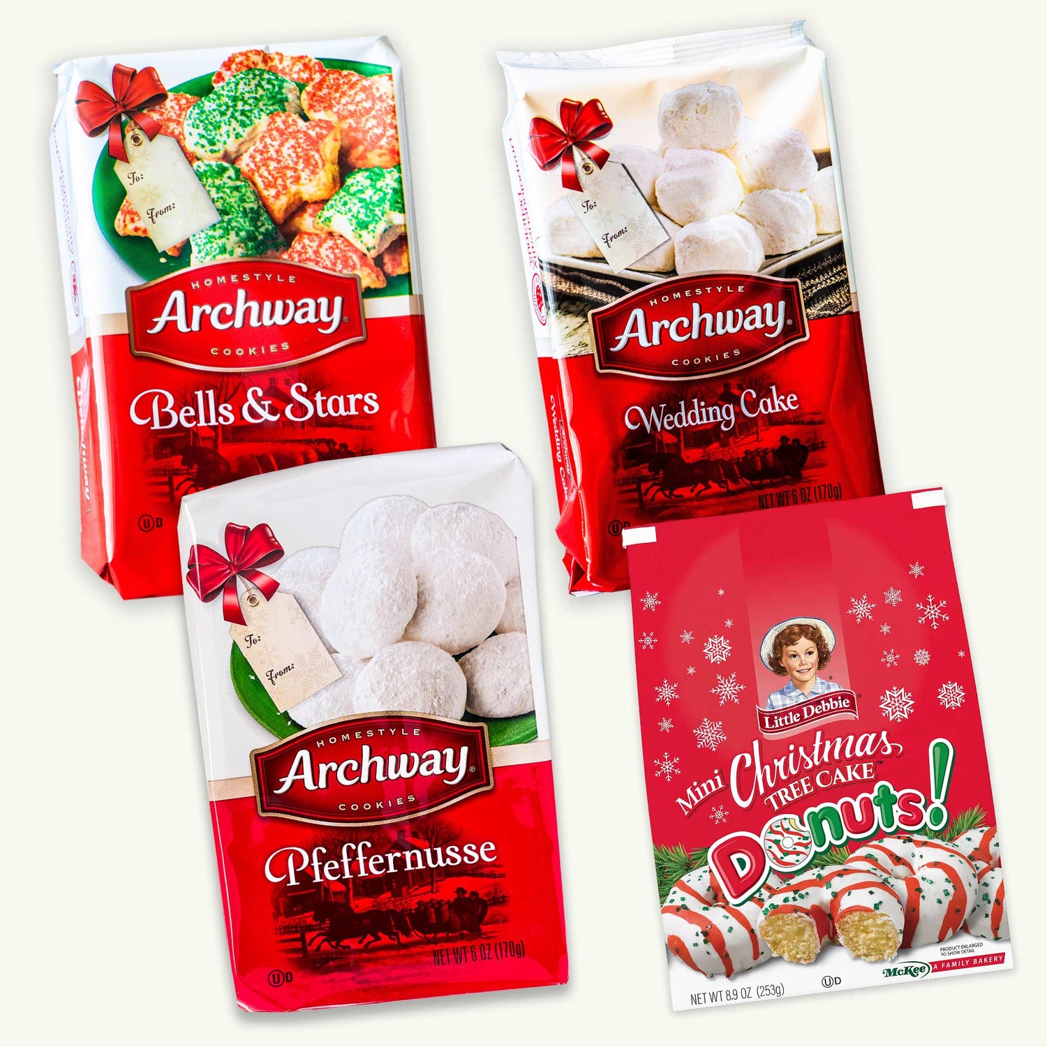 Archway Christmas Holiday Cookies Variety Pack - Bells and Stars, Wedding Cake, Pfeffernusse - Little Debbie Christmas Mini Donuts - 4 Packs
