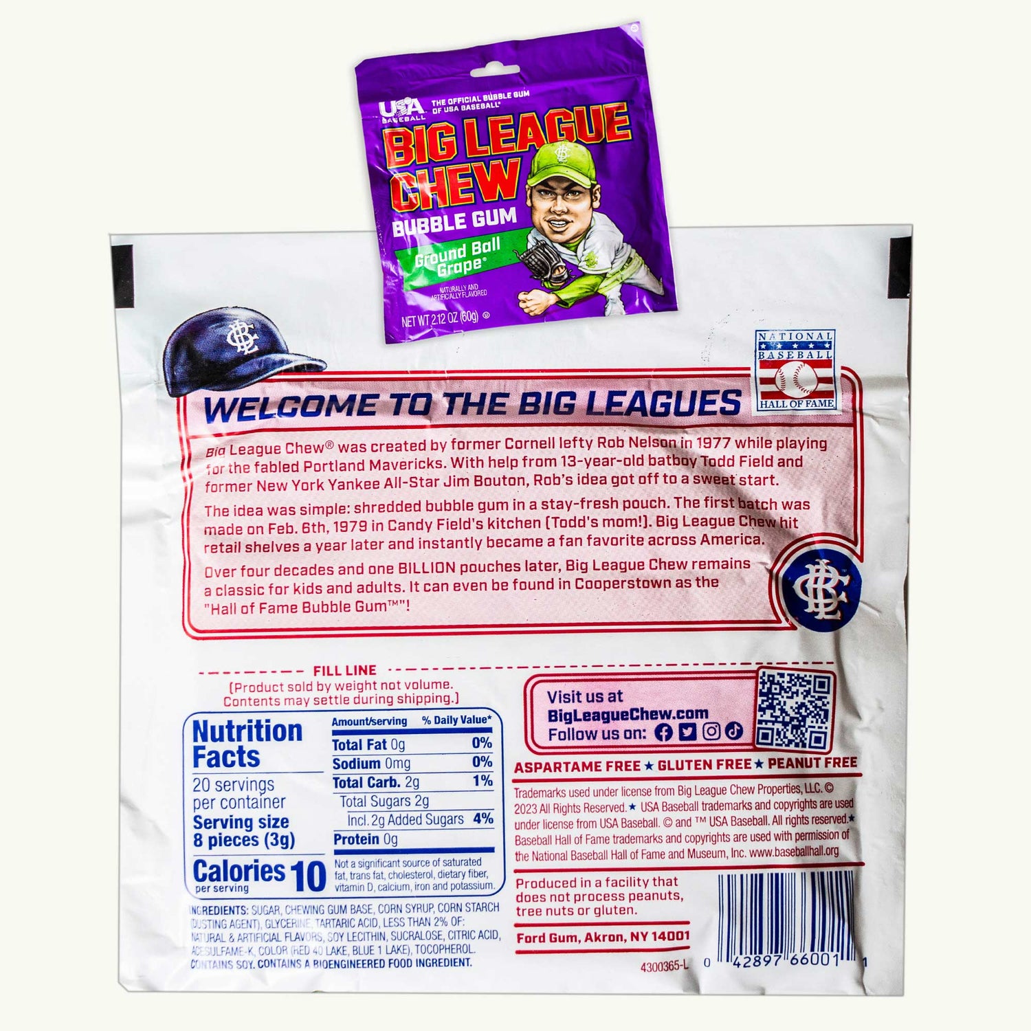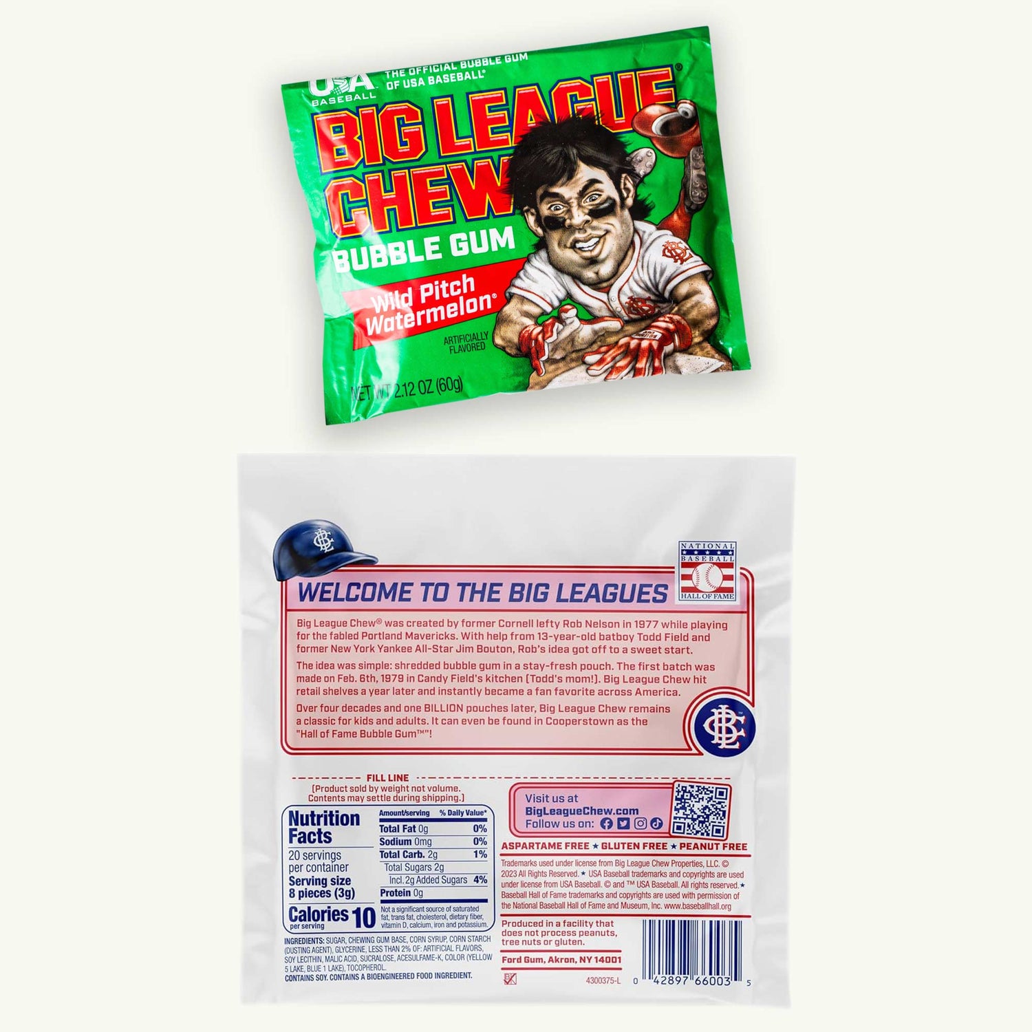 This 12-pack variety bundle includes Curveball Cotton Candy, Wild Pitch Watermelon, Ground Ball Grape, and Big Rally Blue Raspberry—each in the iconic 2.12oz pouch. With 3 pouches of each flavor, this pack delivers bold, fruity fun in Big League style. Perfect for sports fans, team snacks, party favors, and anyone who likes to chew big.