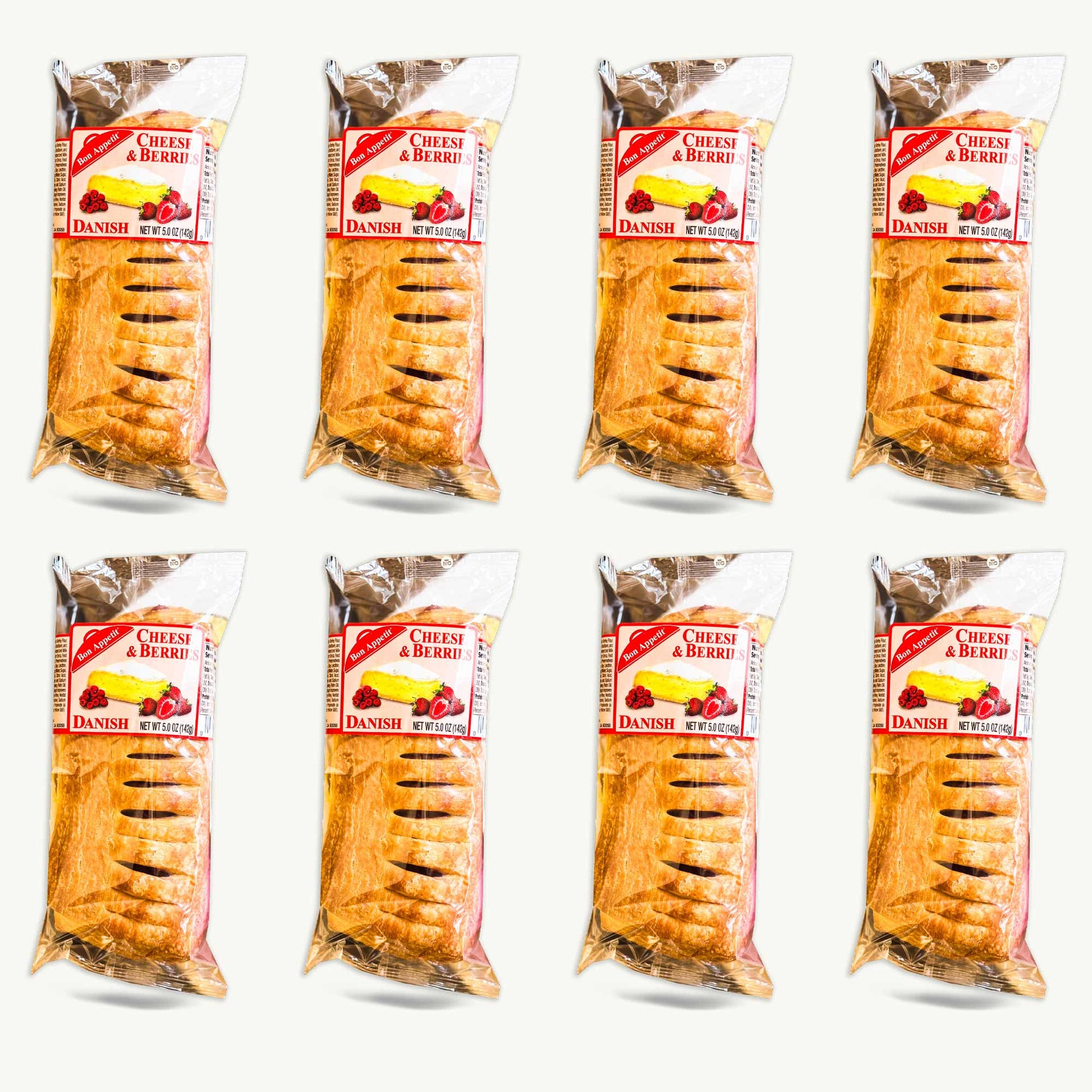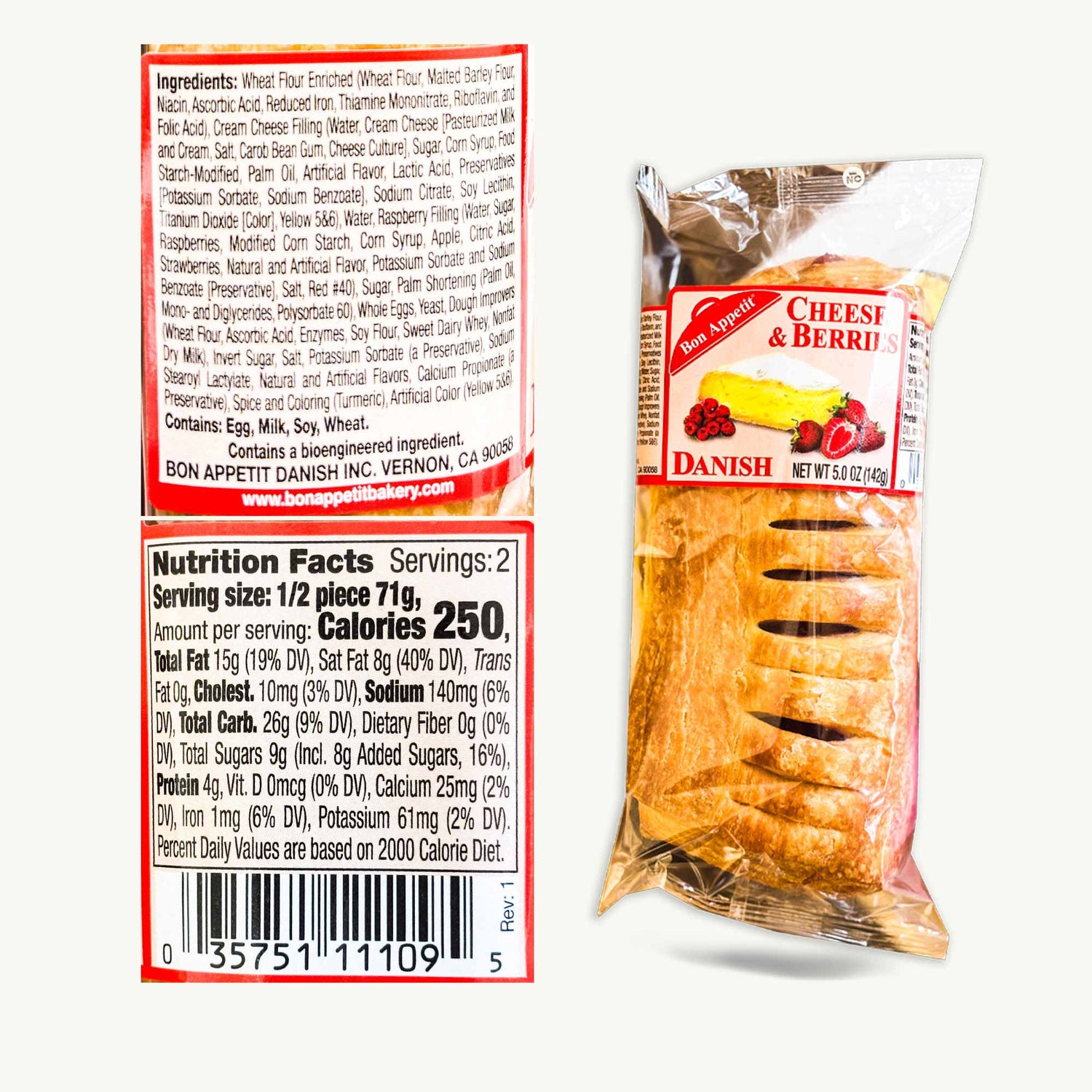 Enjoy the delightful taste of Bon Appetit Cheese and Berries Danish. This 5oz flaky pastry is filled with creamy cheese and sweet mixed berry filling, perfect for breakfast or a snack.