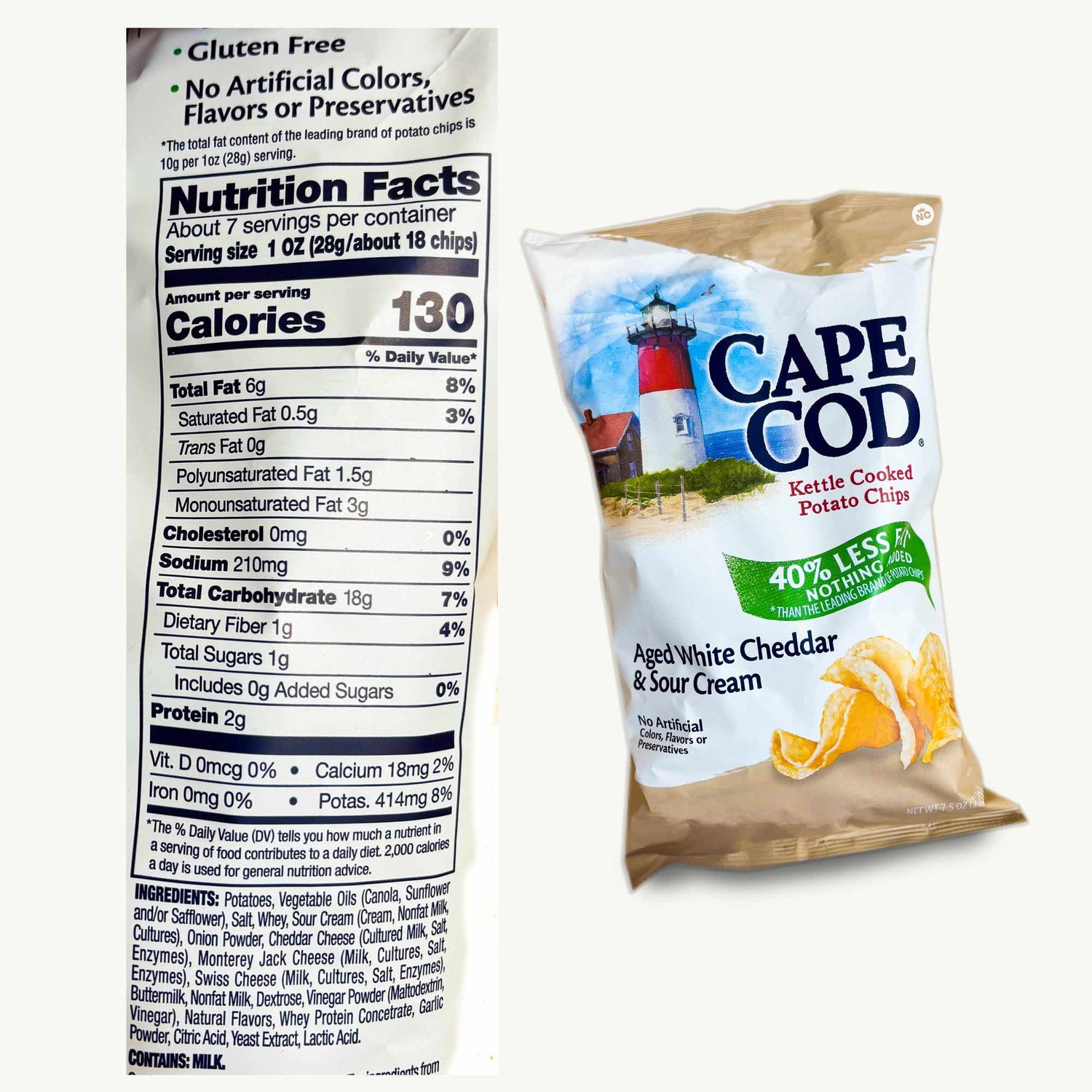 Savor the rich and tangy flavor of Cape Cod Aged White Cheddar and Sour Cream Less Fat Potato Chips! This 7.5oz bag features thick-cut, kettle-cooked chips that are perfectly seasoned with aged white cheddar and a hint of sour cream.