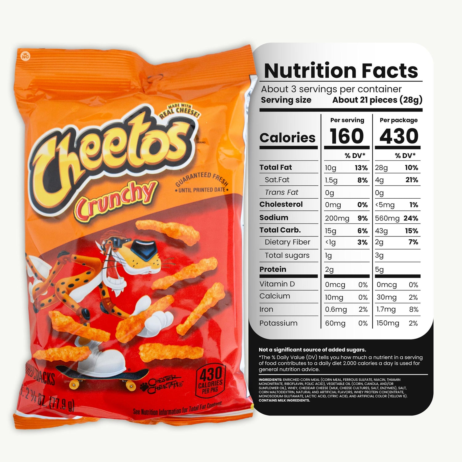 Bring the heat and flavor with the snack that started it all β Cheetos Crunchy Cheese Flavored Snacks. Each bite delivers that signature cheddar kick and unmistakable crunch that keeps fans reaching back for more. Perfectly portioned in a 2.75oz grab-and-go bag, itβs your ticket to instant cheesy satisfaction wherever you snack β from the office desk to the road trip seat.