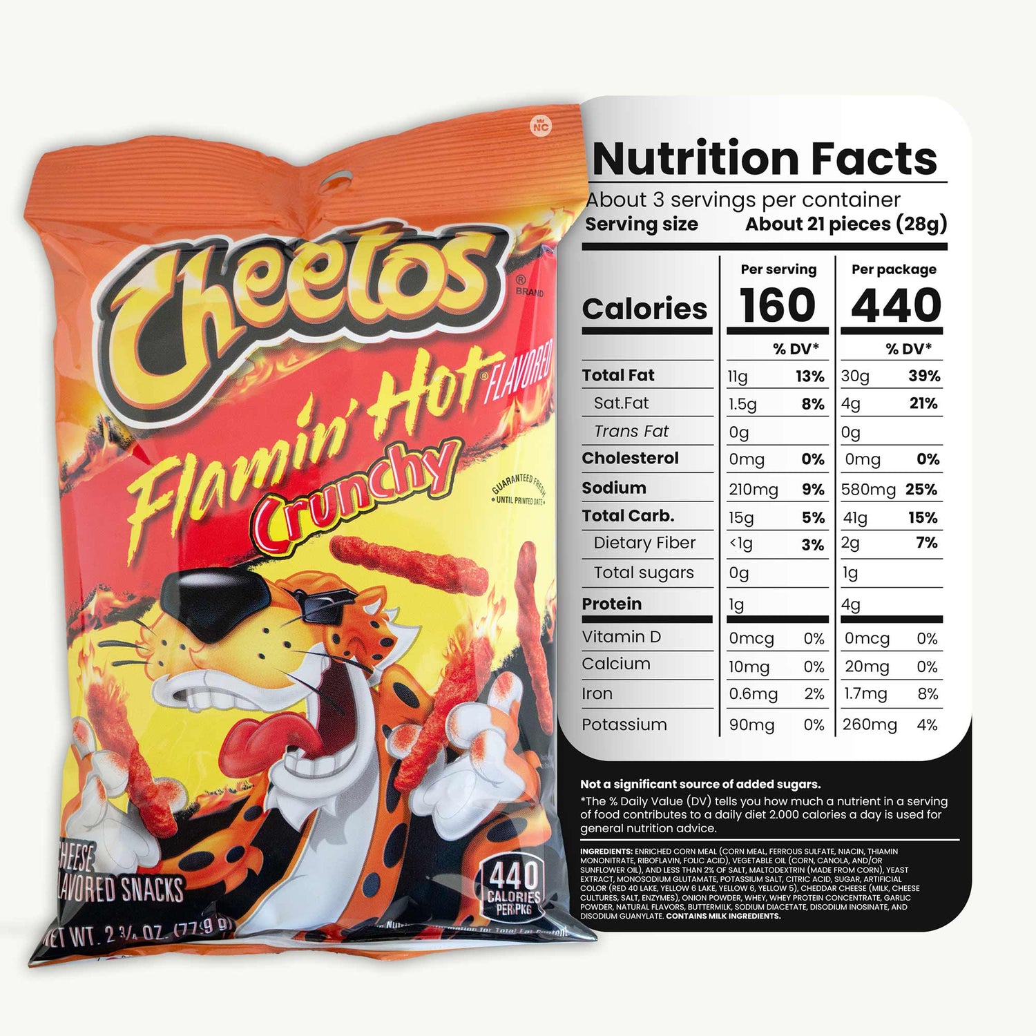 Cheetos Flamin’ Hot Crunchy Cheese Flavored Snacks ignite your taste buds with an unforgettable blend of spicy heat and classic cheesy goodness. Every bite packs that fiery kick fans crave — balanced with the signature Cheetos crunch that made it famous. Perfect for on-the-go snacking, late-night cravings, or anyone who loves their snacks with attitude.