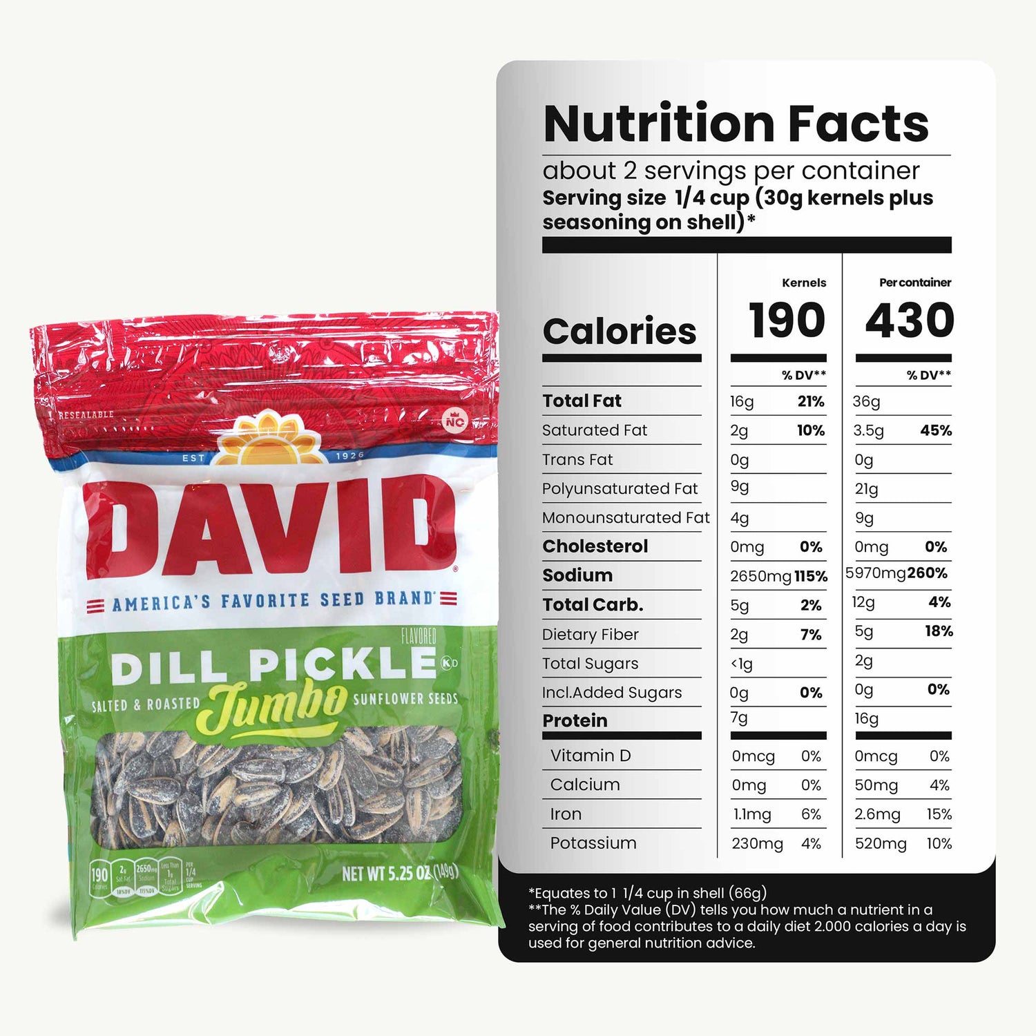 Savor the tangy crunch of David Jumbo Dill Pickle Sunflower Seeds. This 5.25oz pack features extra-large seeds bursting with bold dill pickle flavor, perfect for snacking anytime.
