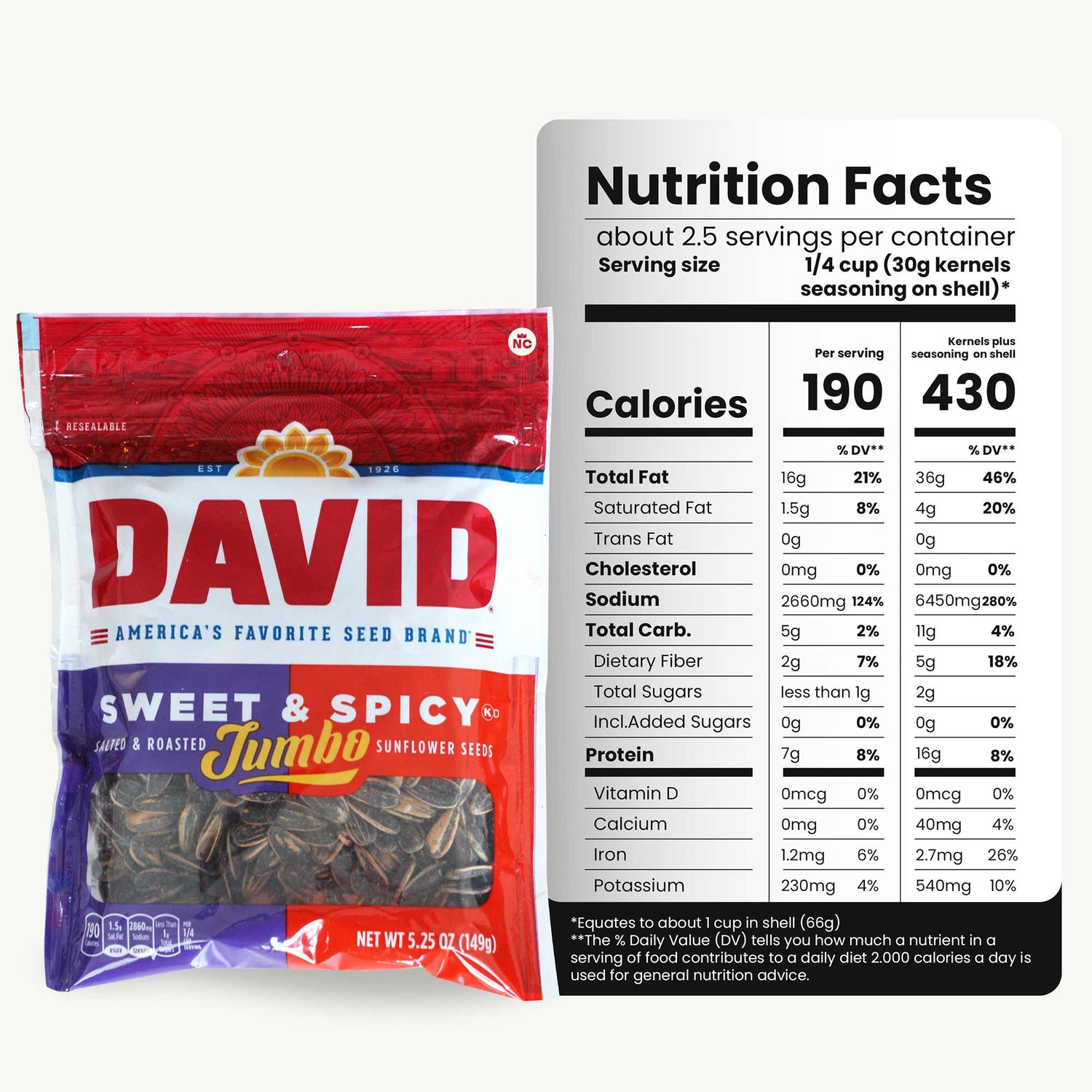 Enjoy the perfect balance of flavor with David Jumbo Sweet & Spicy Sunflower Seeds. This 5.25oz pack features extra-large seeds coated in a bold blend of sweet and spicy seasoning, perfect for snacking anytime.