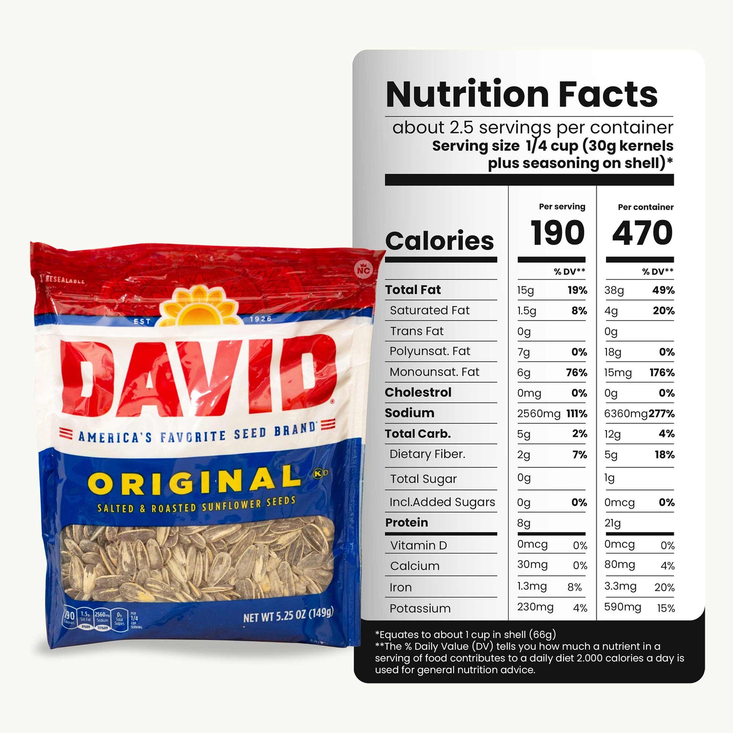 Enjoy the classic taste of DAVID Original Salted Roasted Sunflower Seeds. This 5.25oz pack features extra-large seeds perfectly roasted and lightly salted for a timeless, satisfying snack.