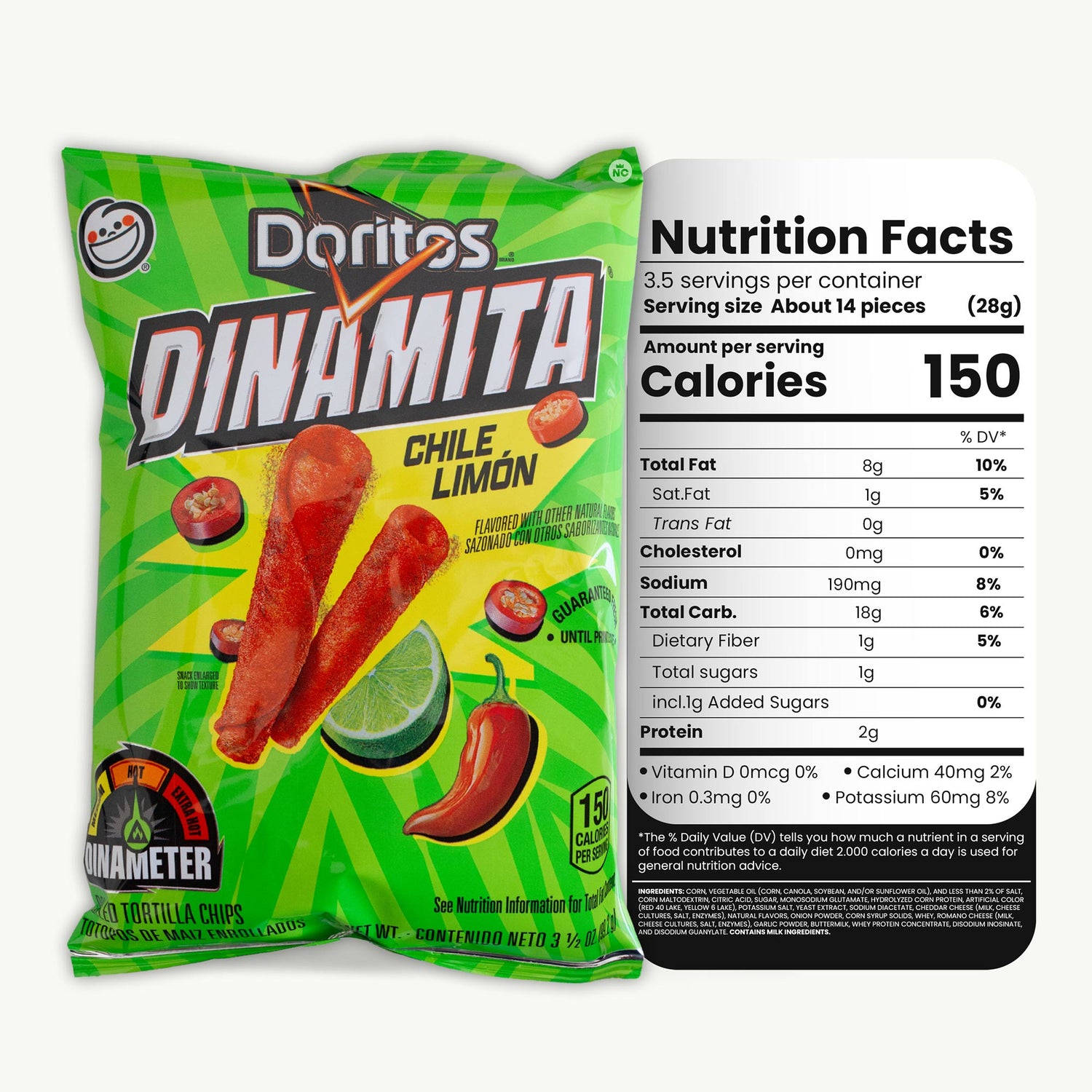 Doritos Dinamita Chile Limón Tortilla Chips turn up the heat with every bite — rolled into crunchy tubes and blasted with bold chili and zesty lime flavor. Each 3.5oz bag delivers an intense, tangy kick that’s perfect for spice lovers craving adventure. Crunchy, spicy, and unforgettable — these are Doritos with a twist.