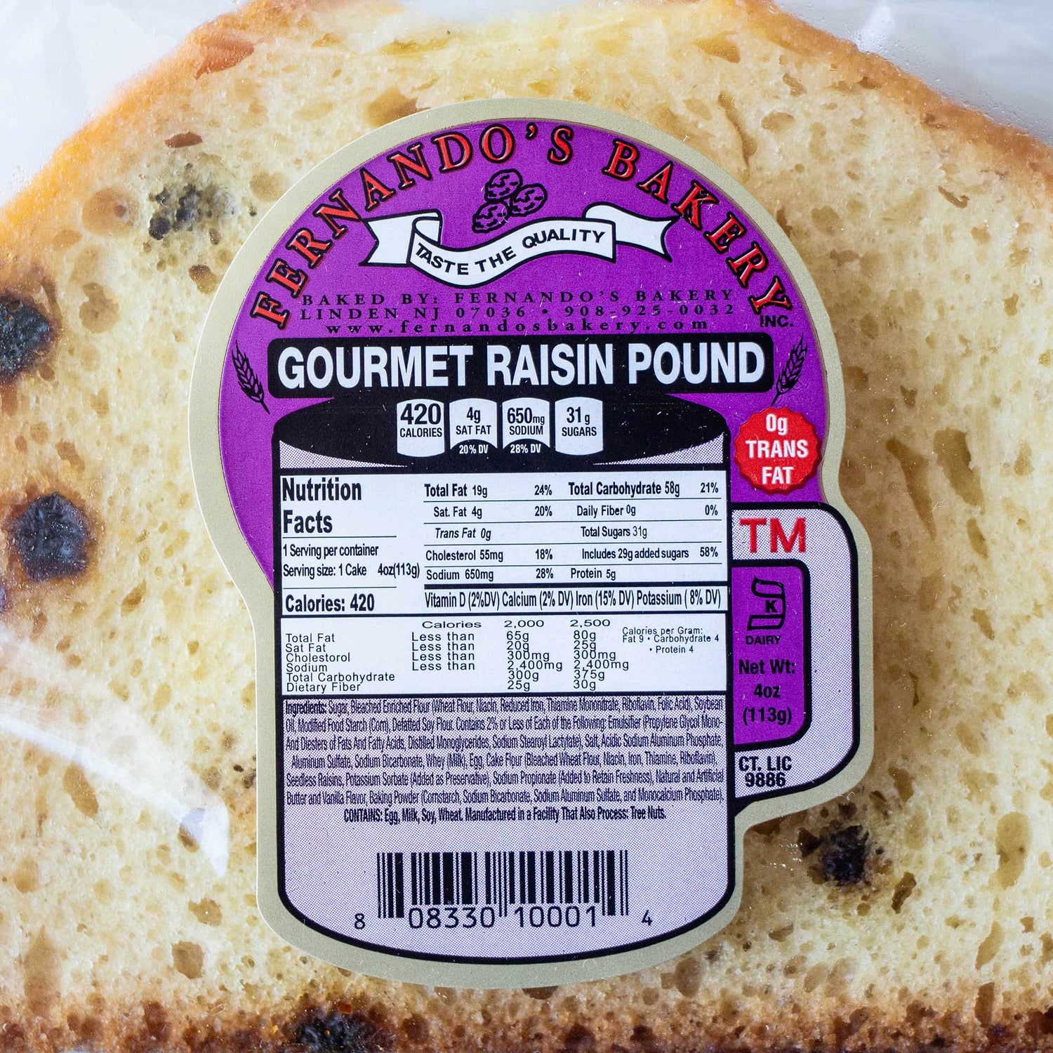 Experience the timeless delight of Fernando's Bakery Gourmet Raisin Pound Cake. This 4oz individually wrapped treat combines the rich, buttery texture of traditional pound cake with the sweet, chewy goodness of plump raisins. Perfect for on-the-go snacking, lunchboxes, or a quick dessert, it's a convenient and satisfying treat for any occasion.