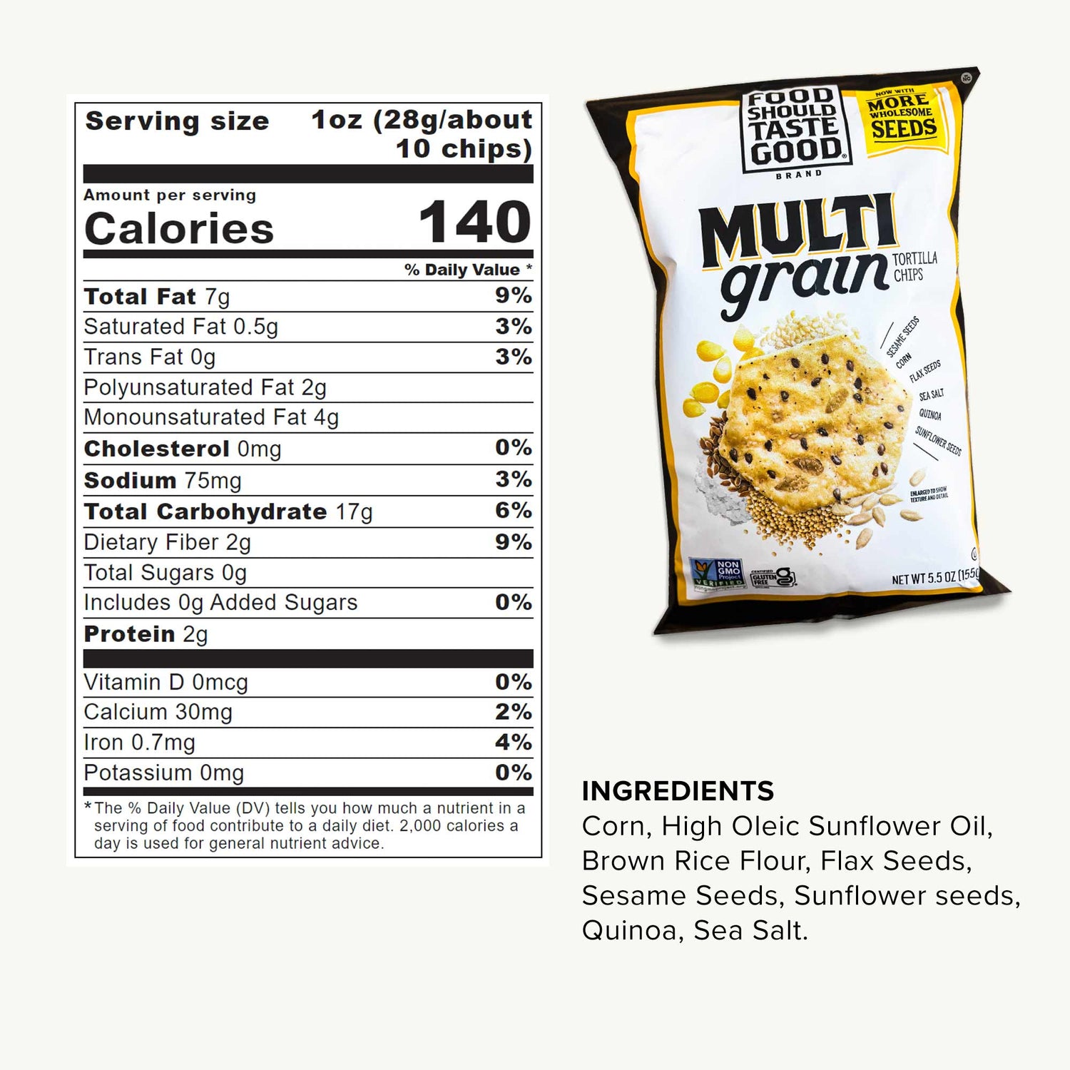 Savor the wholesome goodness of Food Should Taste Good Multigrain Tortilla Chips! This 5.5oz bag is packed with crunchy tortilla chips made from a nutritious blend of flax, sunflower, and sesame seeds, along with quinoa and whole grain corn.