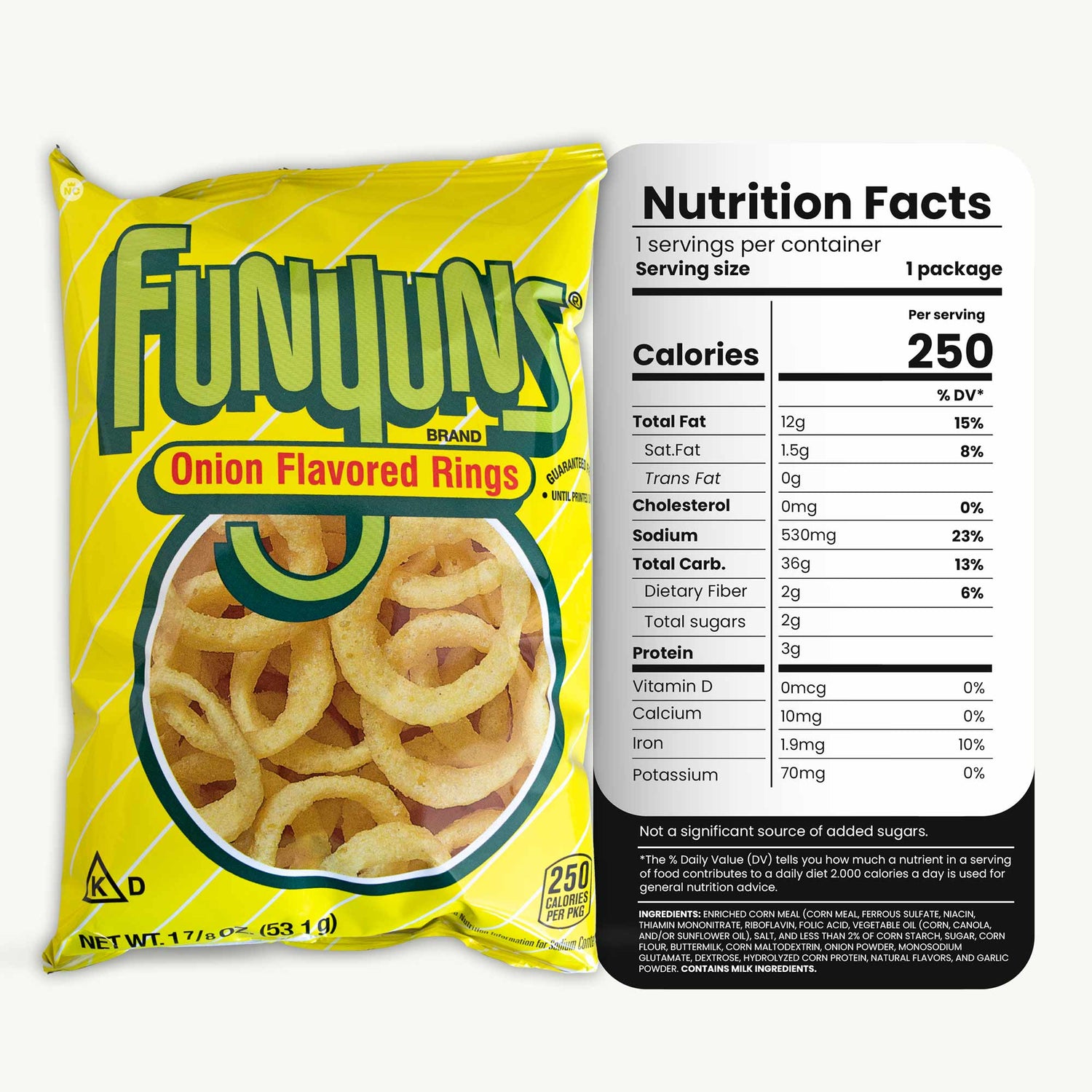 These classic Funyuns Onion Flavored Rings deliver that signature crispy texture and zesty onion taste that snack lovers crave. Each 1.87oz bag packs an irresistible punch of savory flavor β light, crunchy, and full of attitude. Perfect for on-the-go snacking, lunchboxes, or late-night cravings, Funyuns are the crunchy rings that keep you coming back for more.