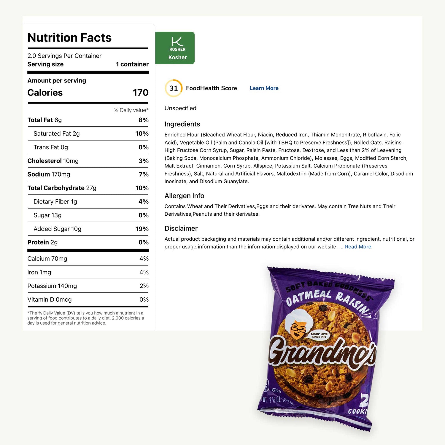 Grandma's Oatmeal Raisin Soft Baked Cookies, 2 Cookie Pack - 2.5oz