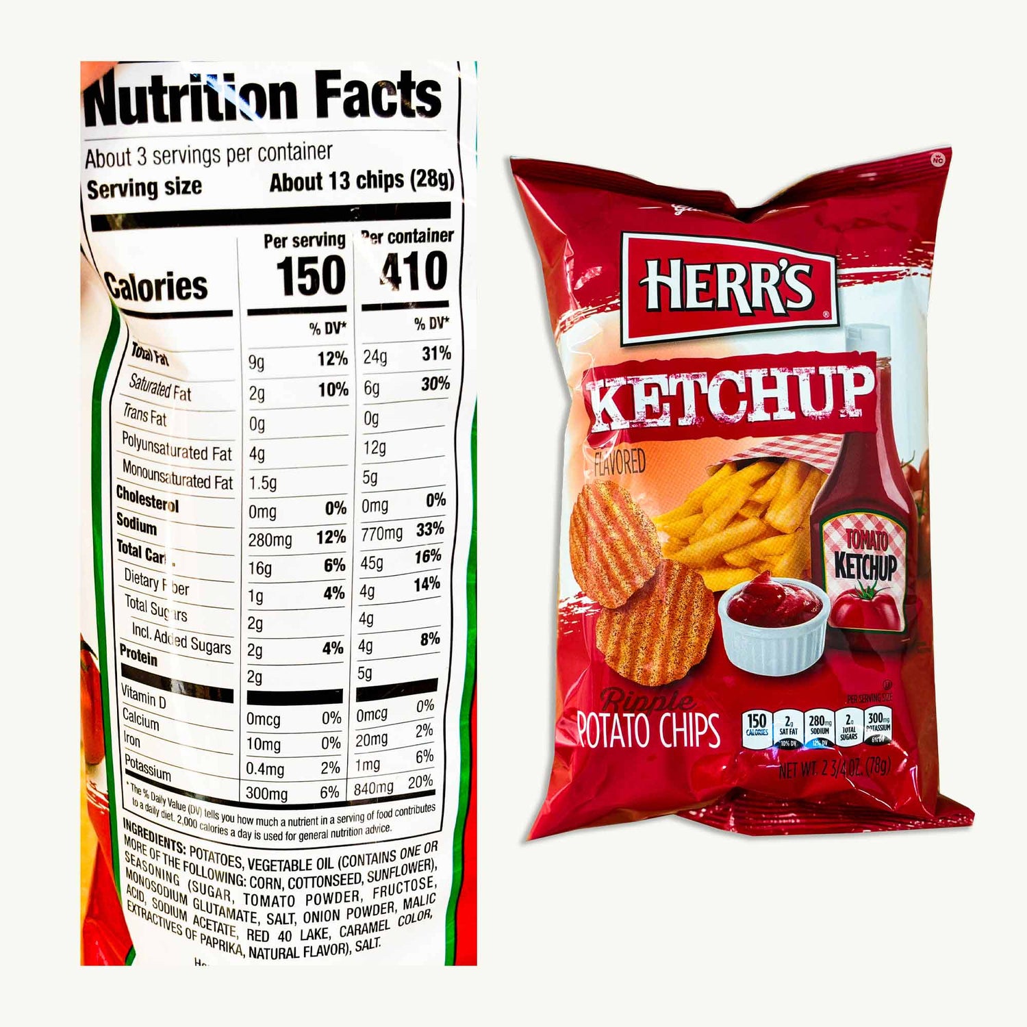 Experience the unique taste of Herr's Ketchup Ripple Potato Chips! This 2.75oz pack delivers perfectly rippled, extra-crispy chips coated in bold, tangy ketchup seasoning—ideal for ketchup and chip lovers alike.