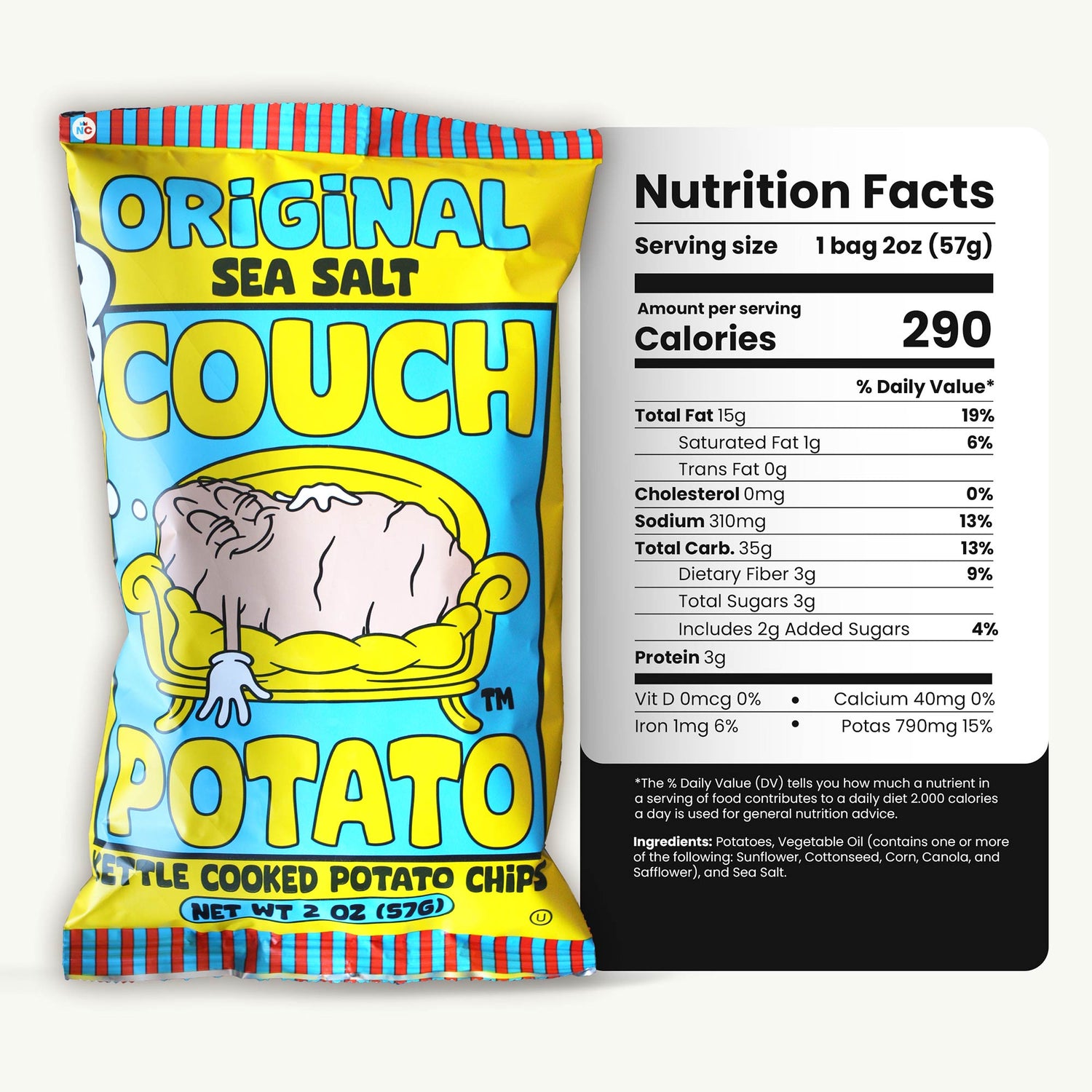 Joe Chips Original Sea Salt Kettle Couch Potato Chips are the classic done right—just thick-cut potatoes, kettle-cooked in small batches, and finished with a perfect sprinkle of sea salt. These 2oz bags deliver bold crunch and clean flavor that goes with everything.