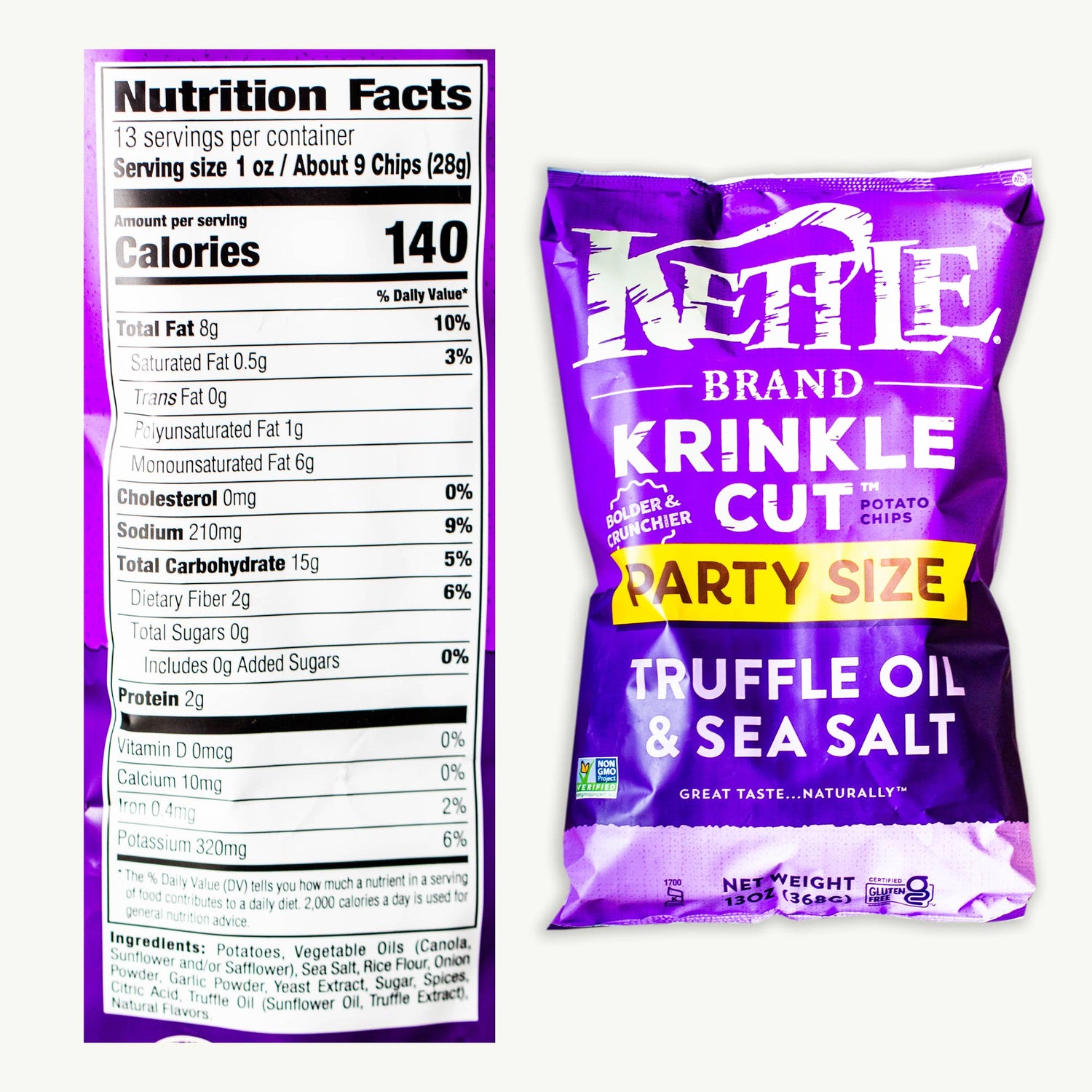 Indulge in the rich, earthy flavor of Kettle Brand's Krinkle Cut Truffle Oil & Sea Salt Potato Chips. These thick-cut, ridged chips are kettle-cooked to perfection, offering a satisfying crunch in every bite. Seasoned with a luxurious blend of truffle oil and sea salt, they deliver a bold taste experience that's both decadent and delicious. Perfect for sharing at gatherings or enjoying as an indulgent snack, this 13oz party-size bag ensures there's plenty to go around.