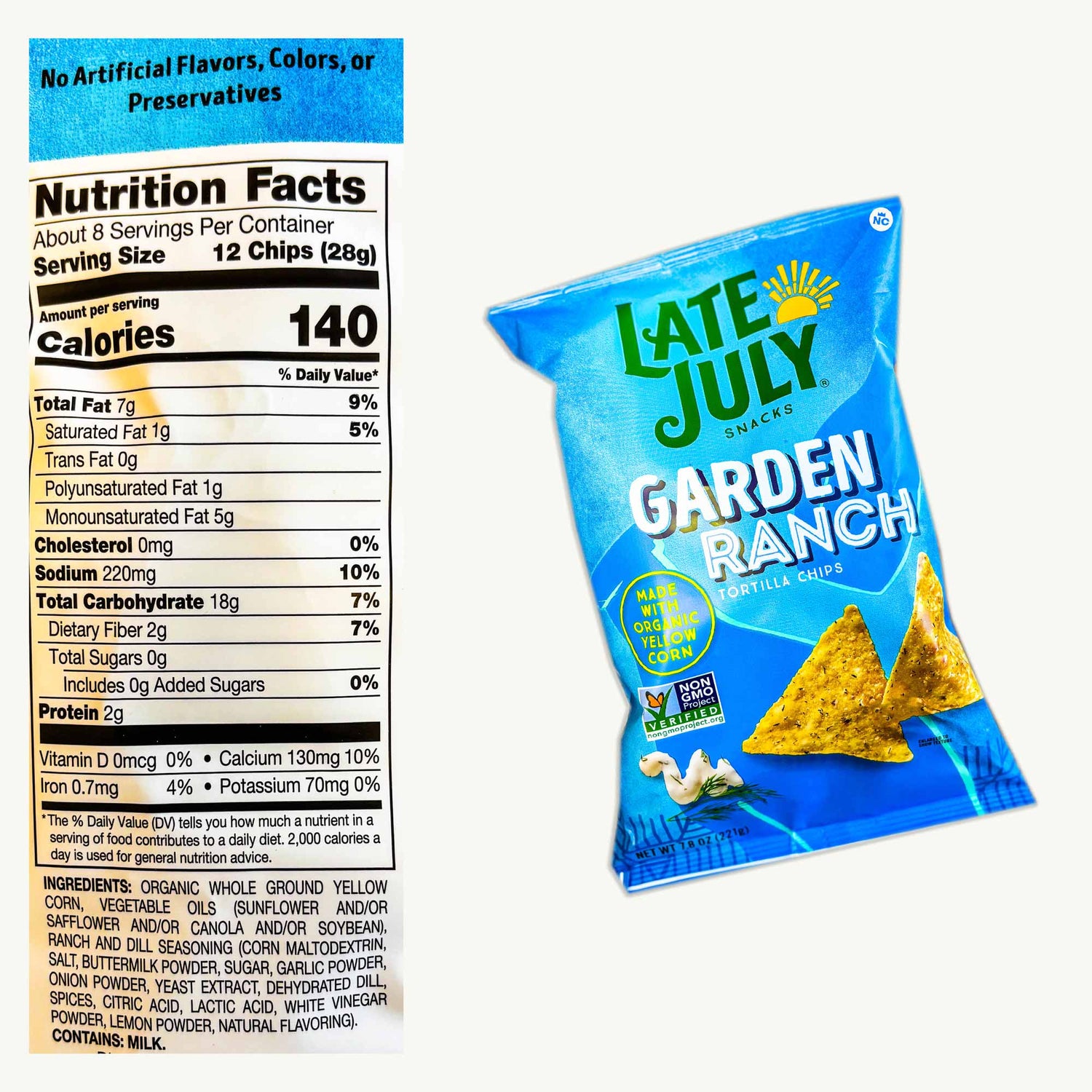 Savor the fresh, zesty flavor of Late July Garden Ranch Tortilla Chips! This 7.8oz bag combines the creamy, tangy taste of ranch dressing with a hint of garden-fresh herbs, all on crispy, organic corn tortilla chips. Perfect for dipping or enjoying straight out of the bag, these chips bring a new twist to snack time.