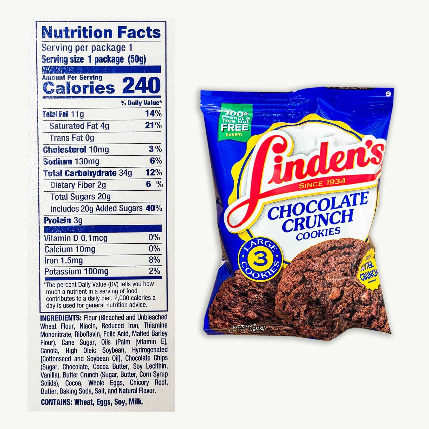Satisfy your sweet tooth with Linden's Chocolate Crunch Cookies. Each pack contains three large, deliciously crispy cookies infused with rich, decadent chocolate flavor, offering a perfectly satisfying crunch in every bite. Individually wrapped in a convenient 1.8oz package, they're ideal for snacking at home, school, work, or wherever your cravings strike.