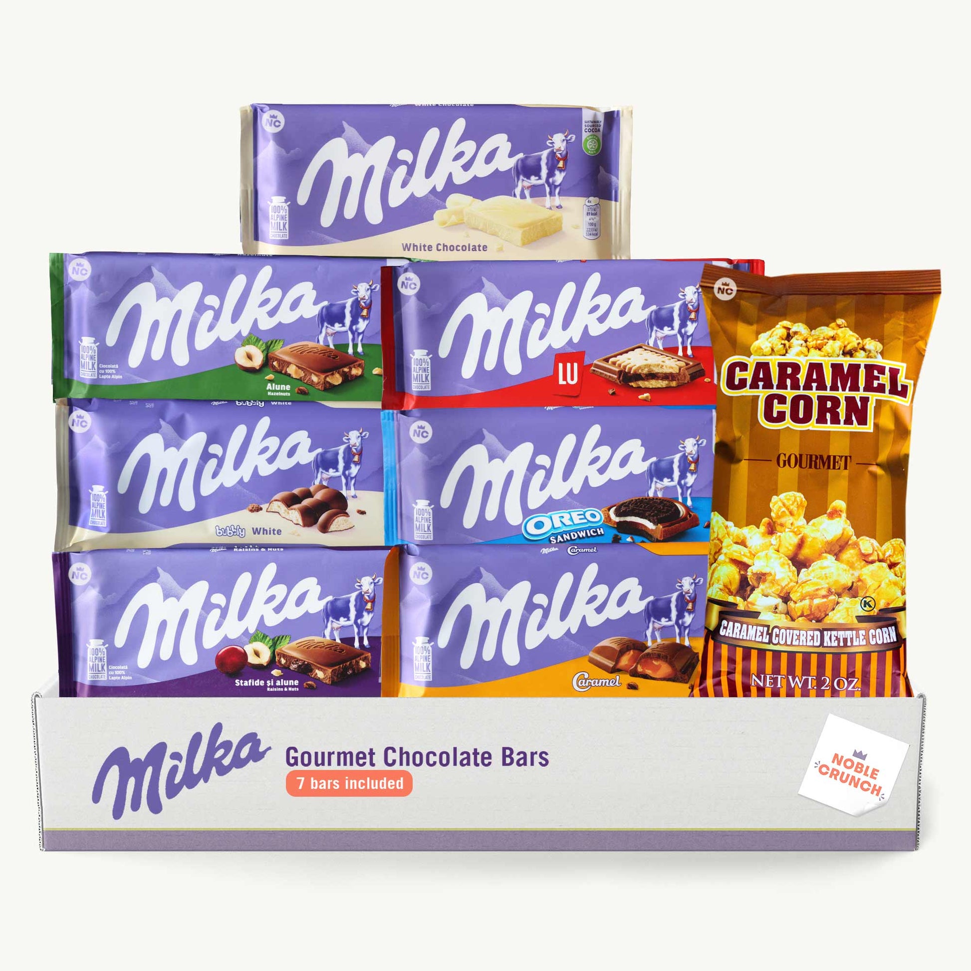 🍫 SEVEN DELICIOUS MILKA FLAVORS – Enjoy a variety of Milka favorites, including Hazelnut, White Chocolate, LU Biscuit, Bubbly White, Oreo, Nuts & Raisins, and Caramel.