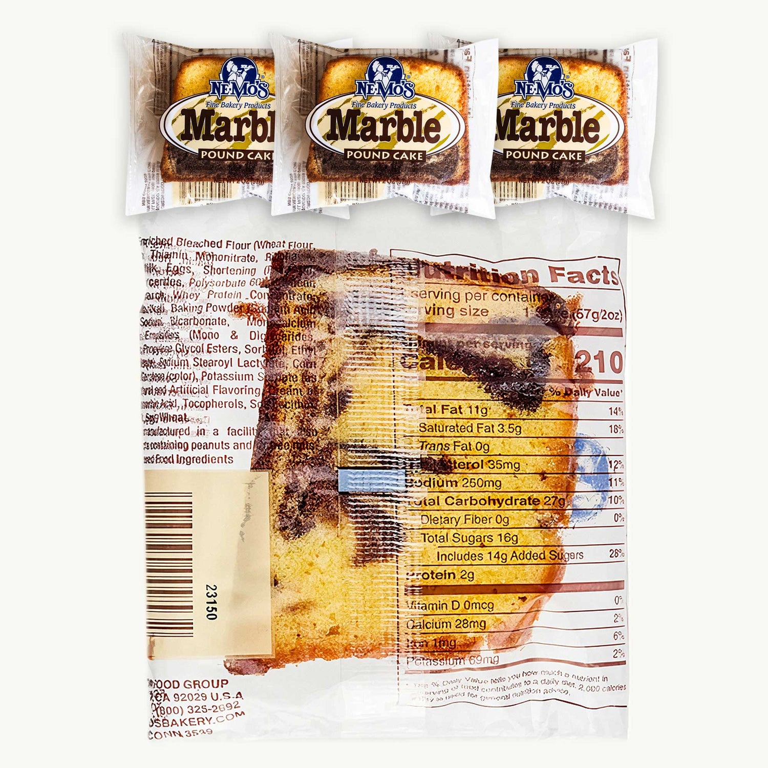 Enjoy the classic swirl of chocolate and vanilla with Nemo’s Marble Pound Cake — now in convenient 2oz snack-size slices. Each mini loaf delivers a buttery-soft texture with just the right touch of sweetness, perfect for coffee breaks, lunchboxes, or on-the-go indulgence. Fresh-baked flavor meets ultimate convenience in this ready-to-enjoy cake bundle.