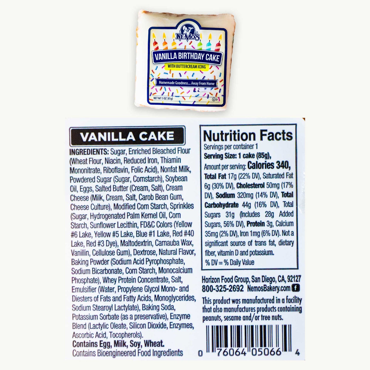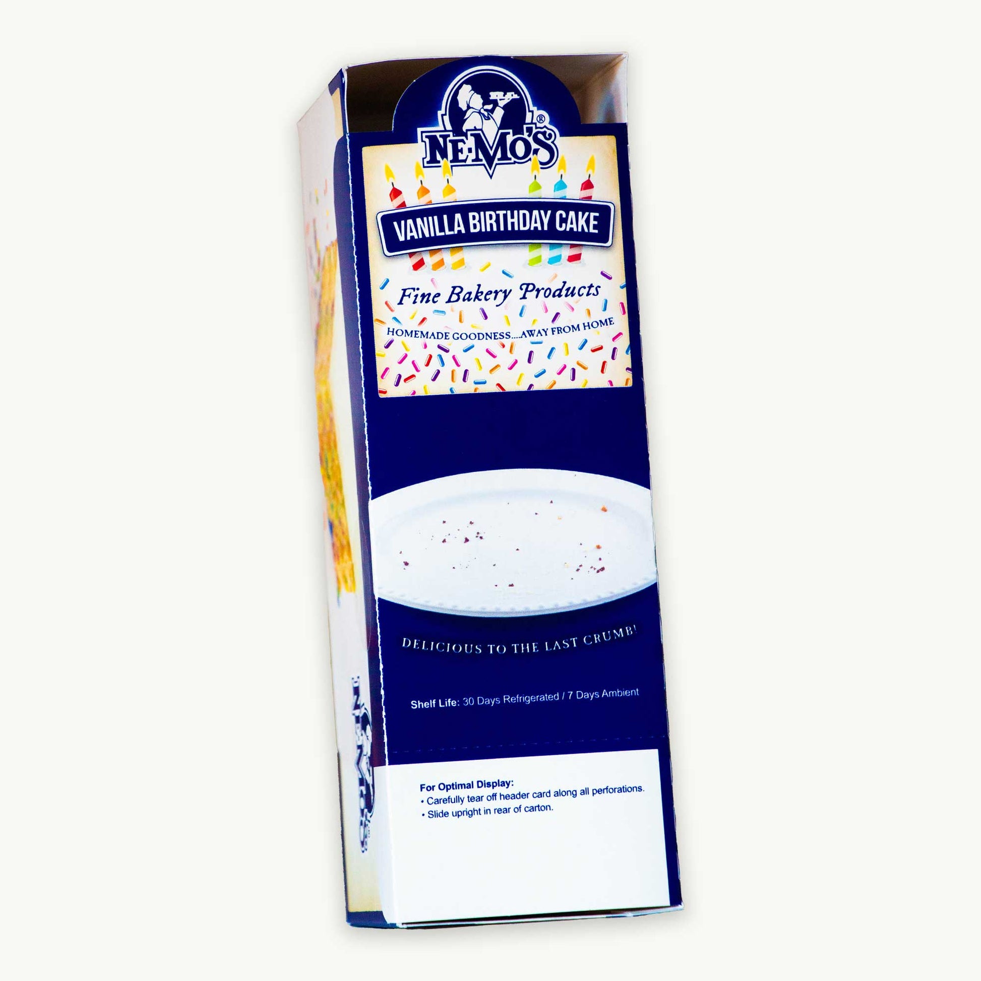 This Nemo’s Vanilla Birthday Cake is a mini party in every bite — soft, moist, and layered with creamy vanilla frosting and colorful sprinkles. Perfectly portioned at 3oz, it’s a joyful treat for lunchboxes, snack breaks, or on-the-go indulgence. Crafted with care using quality ingredients for that classic homemade taste.