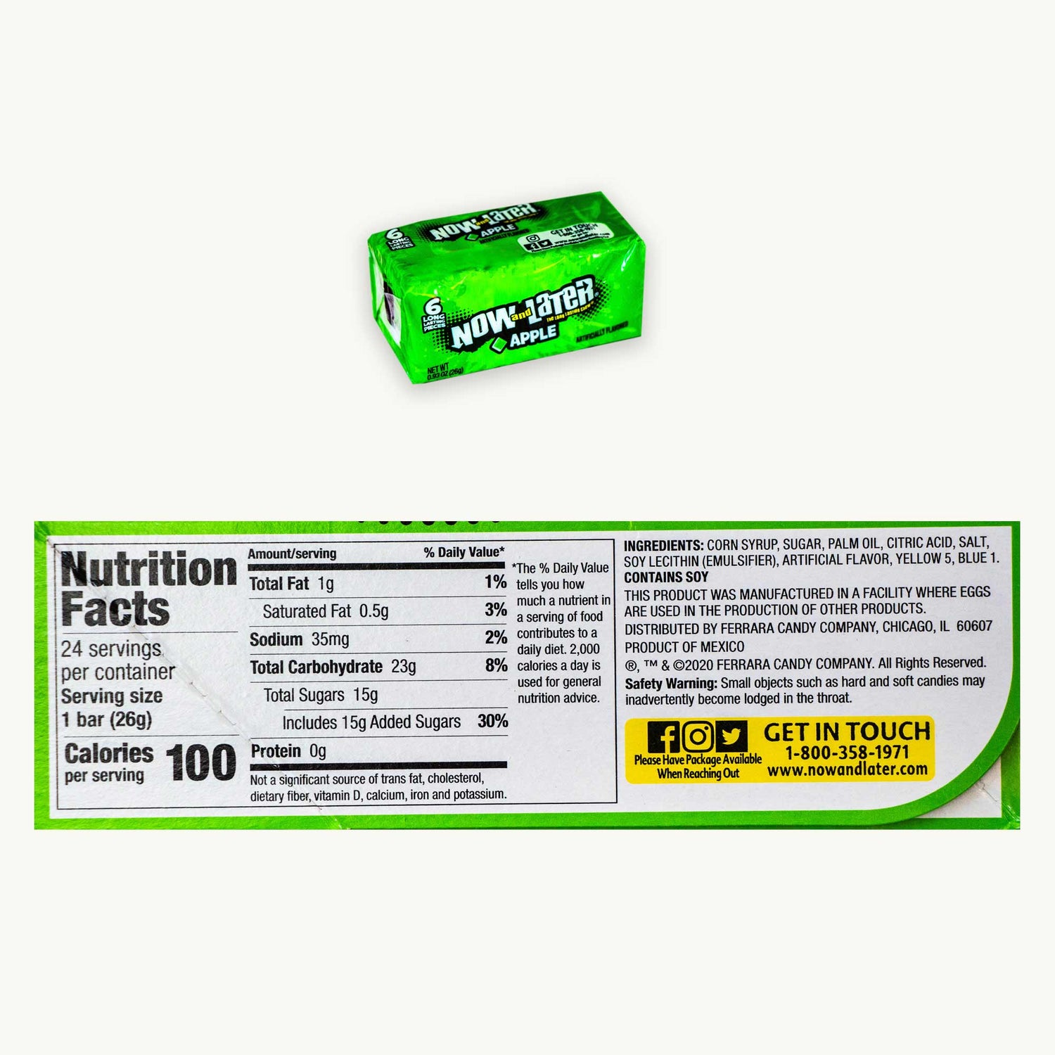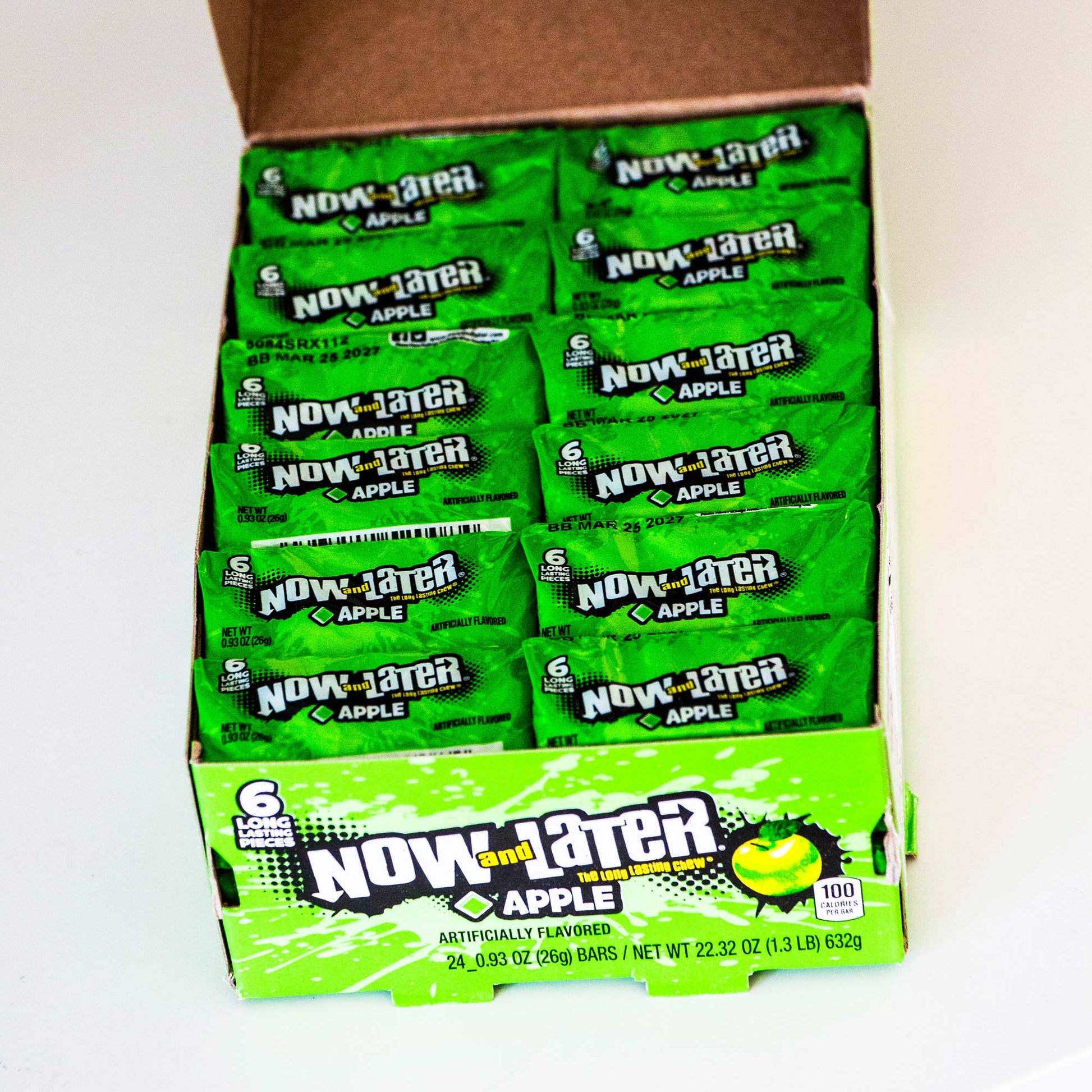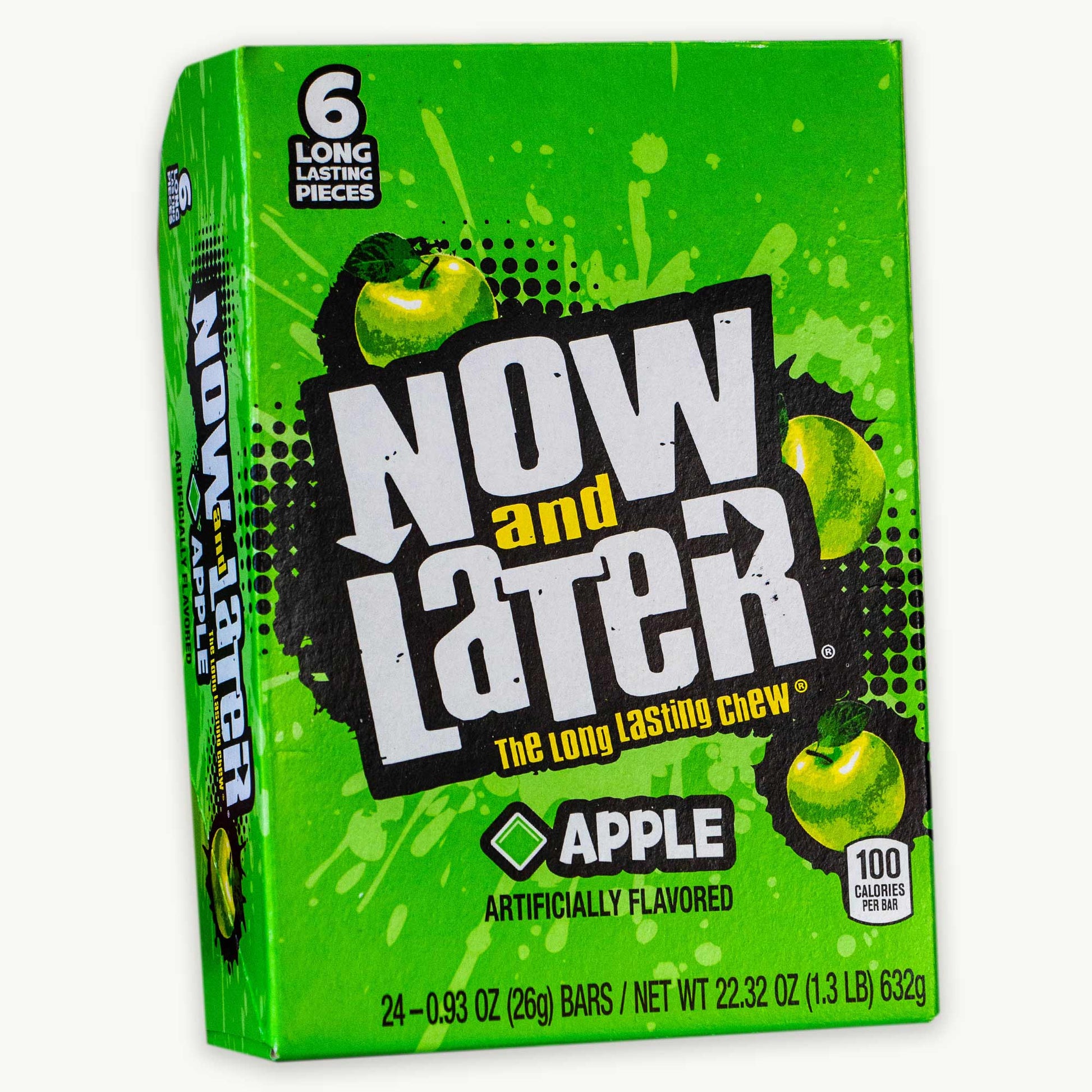 Now and Later Apple Candy delivers that classic sweet-and-tangy taste in a satisfyingly long-lasting chew. Perfect for on-the-go snacking, sharing, or reliving childhood favorites β these bite-sized squares pack the perfect mix of tart and sweet that keeps the flavor going now and later.