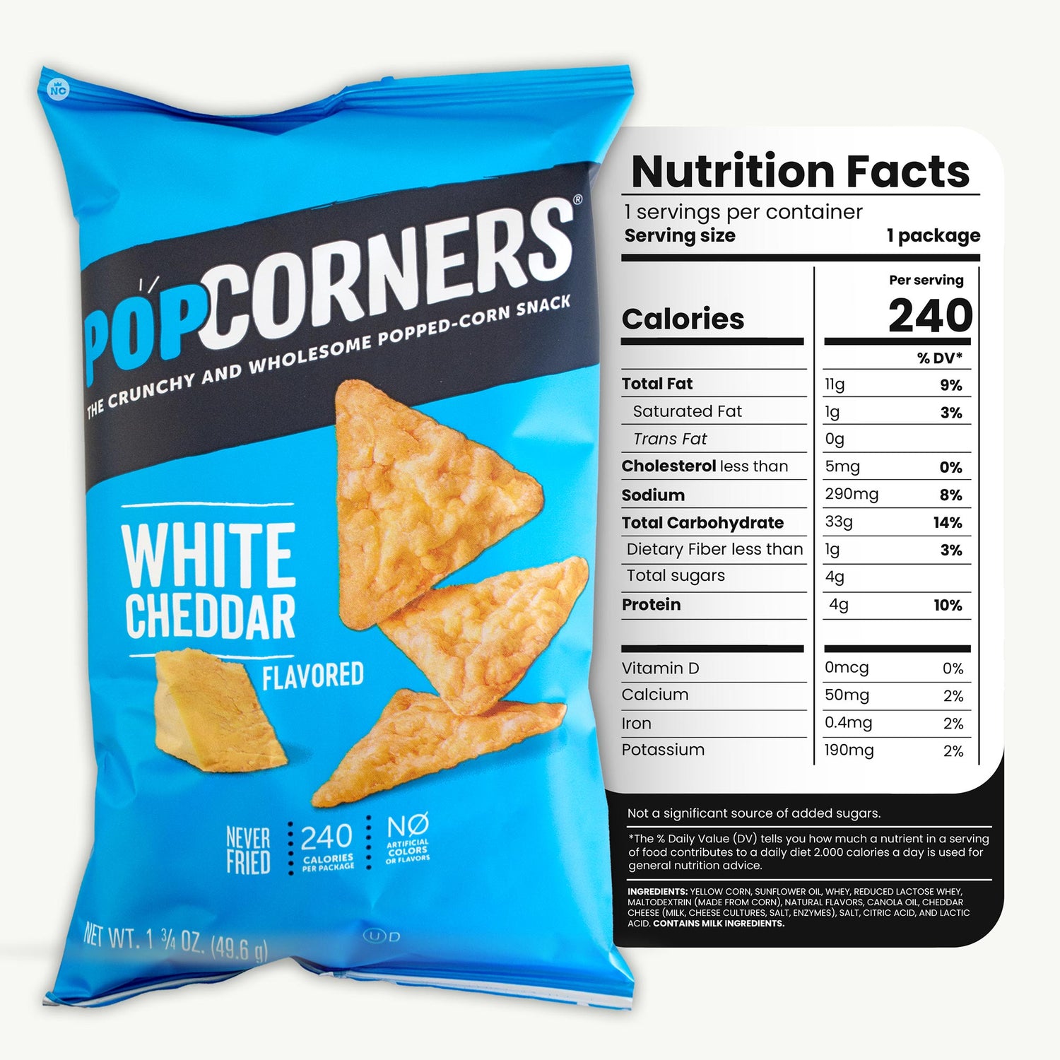 PopCorners Kettle Corn White Cheddar delivers the best of both worlds β a perfectly balanced mix of sweet, salty, and cheesy goodness. Each air-popped triangle is light, crispy, and full of flavor you can feel good about. Gluten-free, kosher, and made with simple non-GMO ingredients, itβs the snack that satisfies every craving in one bite.