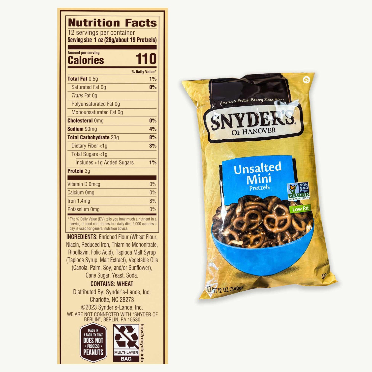 Enjoy a healthier snacking option with Snyder's Unsalted Mini Pretzels! This 12oz bag is packed with perfectly baked, crunchy mini pretzels that are completely unsalted, offering a delicious, guilt-free snack. Ideal for those watching their sodium intake, these pretzels are great for parties, lunchboxes, or any time you crave a light, savory treat. Enjoy the wholesome goodness of Snyder's without the salt.