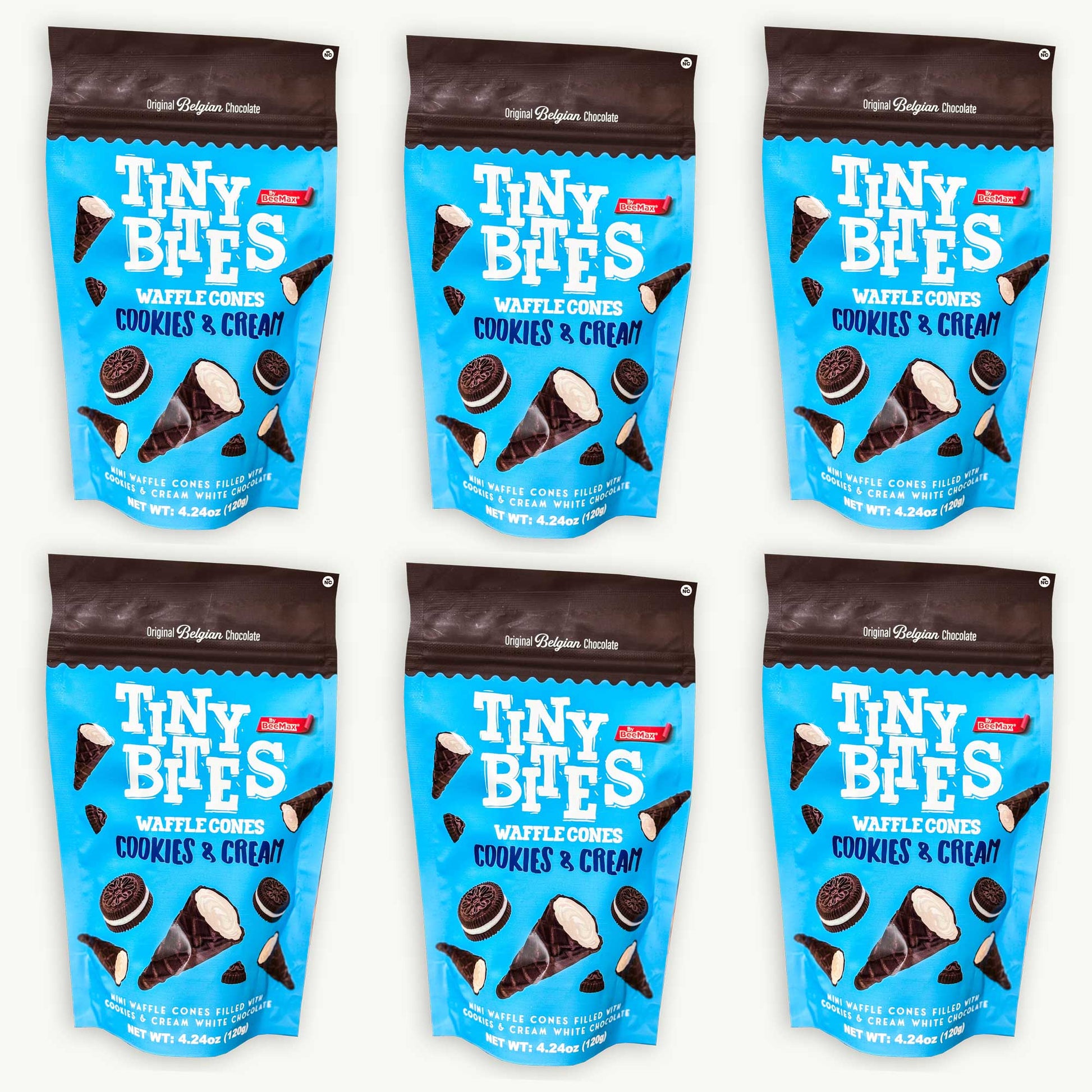 Tiny Bites Cookies & Cream Waffle Cones bring the classic cookies and cream flavor to a crispy, bite-sized treat. This 4.24oz bag features crunchy mini waffle cones filled with smooth, creamy white chocolate and chocolate cookie crumbles, delivering the perfect balance of sweet, crunchy, and chocolatey goodness in every bite.