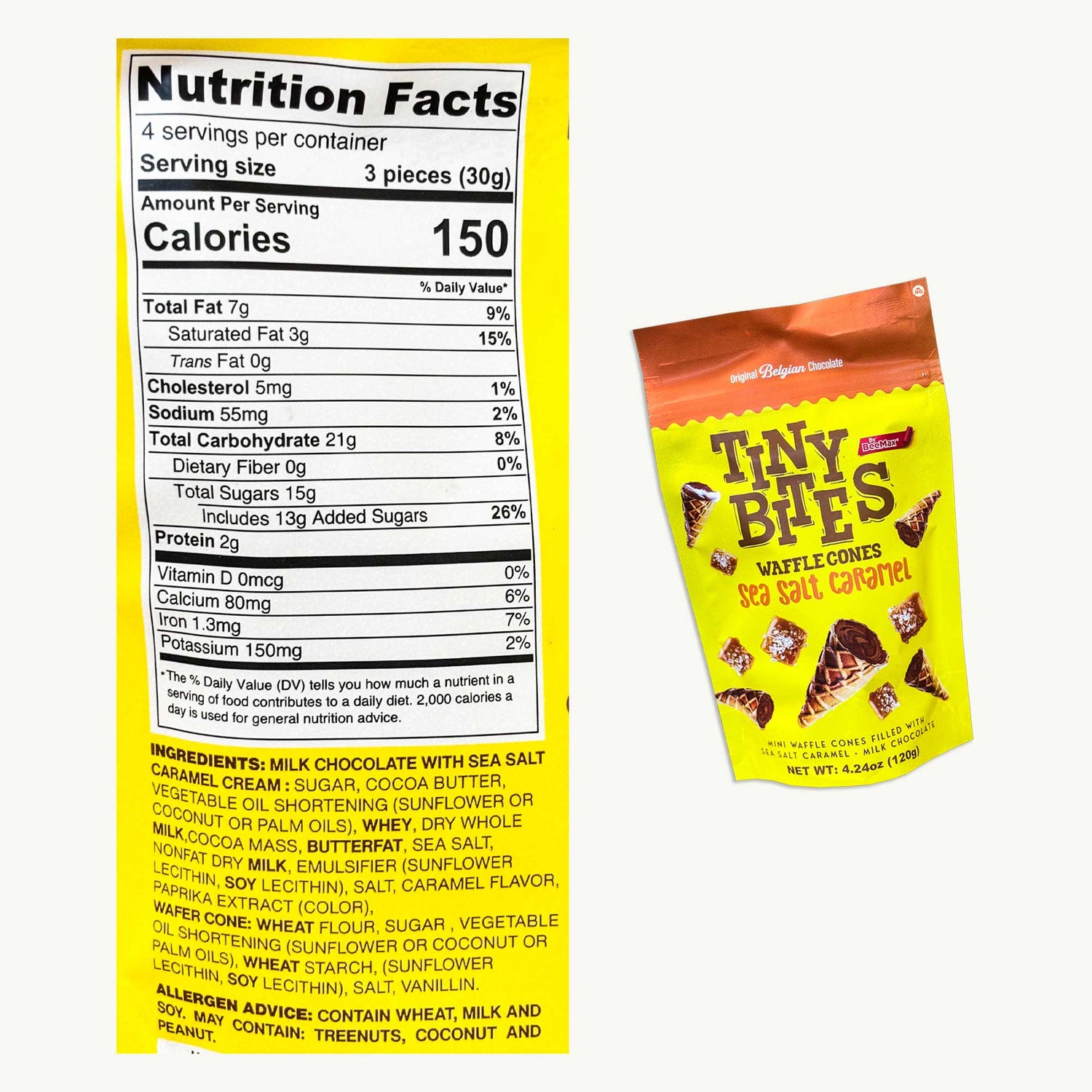 Tiny Bites Sea Salt Caramel Waffle Cones bring a perfect balance of sweet, creamy caramel and a touch of sea salt in a crispy, bite-sized treat. This 4.24oz bag features crunchy mini waffle cones filled with rich, buttery caramel and coated in smooth milk chocolate, creating a delicious contrast of sweet, salty, and crunchy flavors.