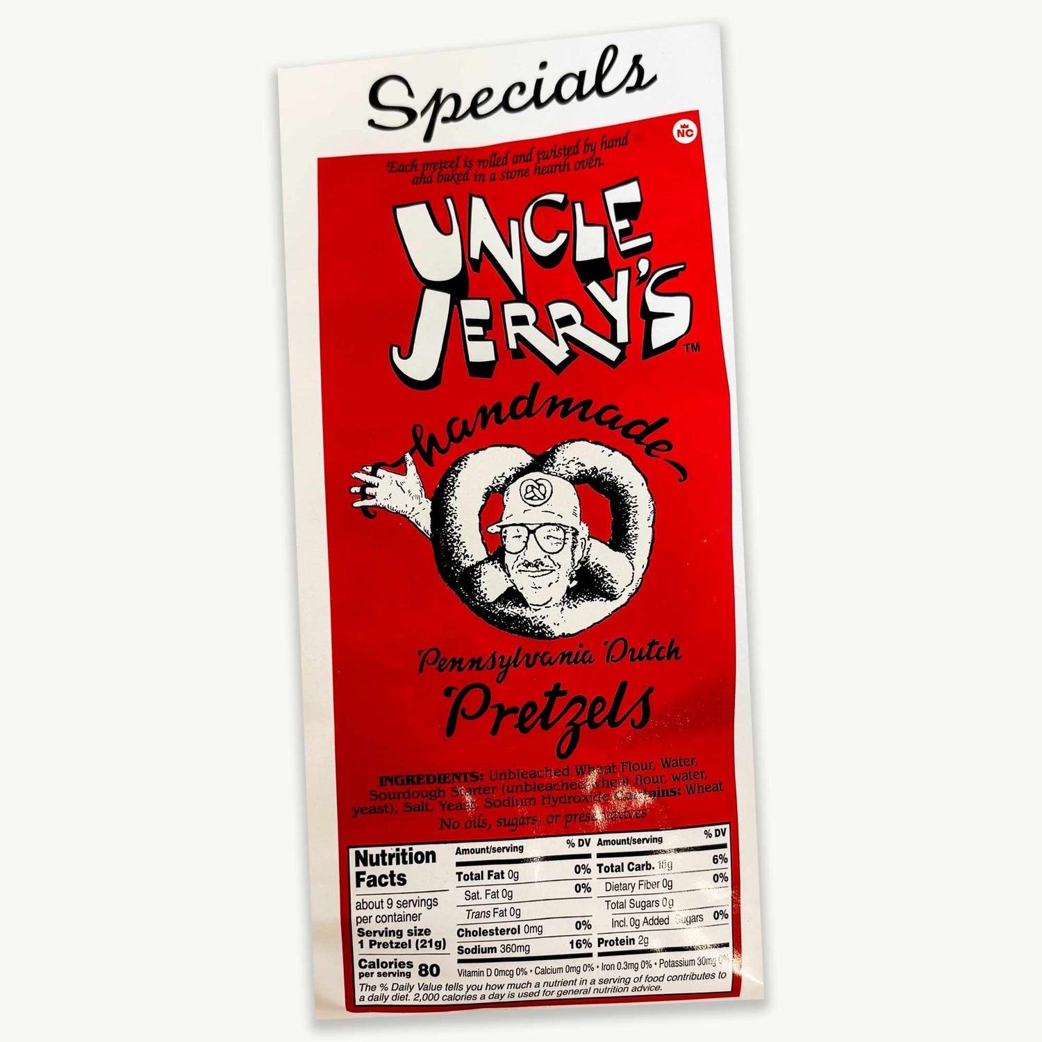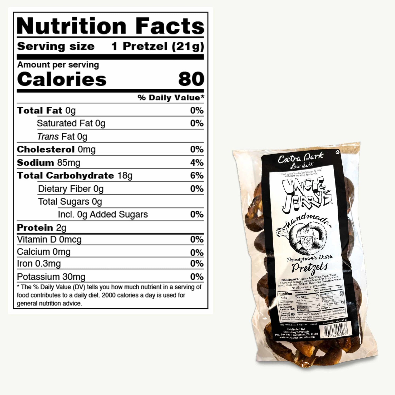 Discover the rich, authentic flavors of Uncle Jerry's Handmade Pretzels with this Variety Pack! This bundle includes three 7oz bags of hand-twisted, slow-baked pretzels: Extra Dark, Specials, and Extra Dark Low Salt.
