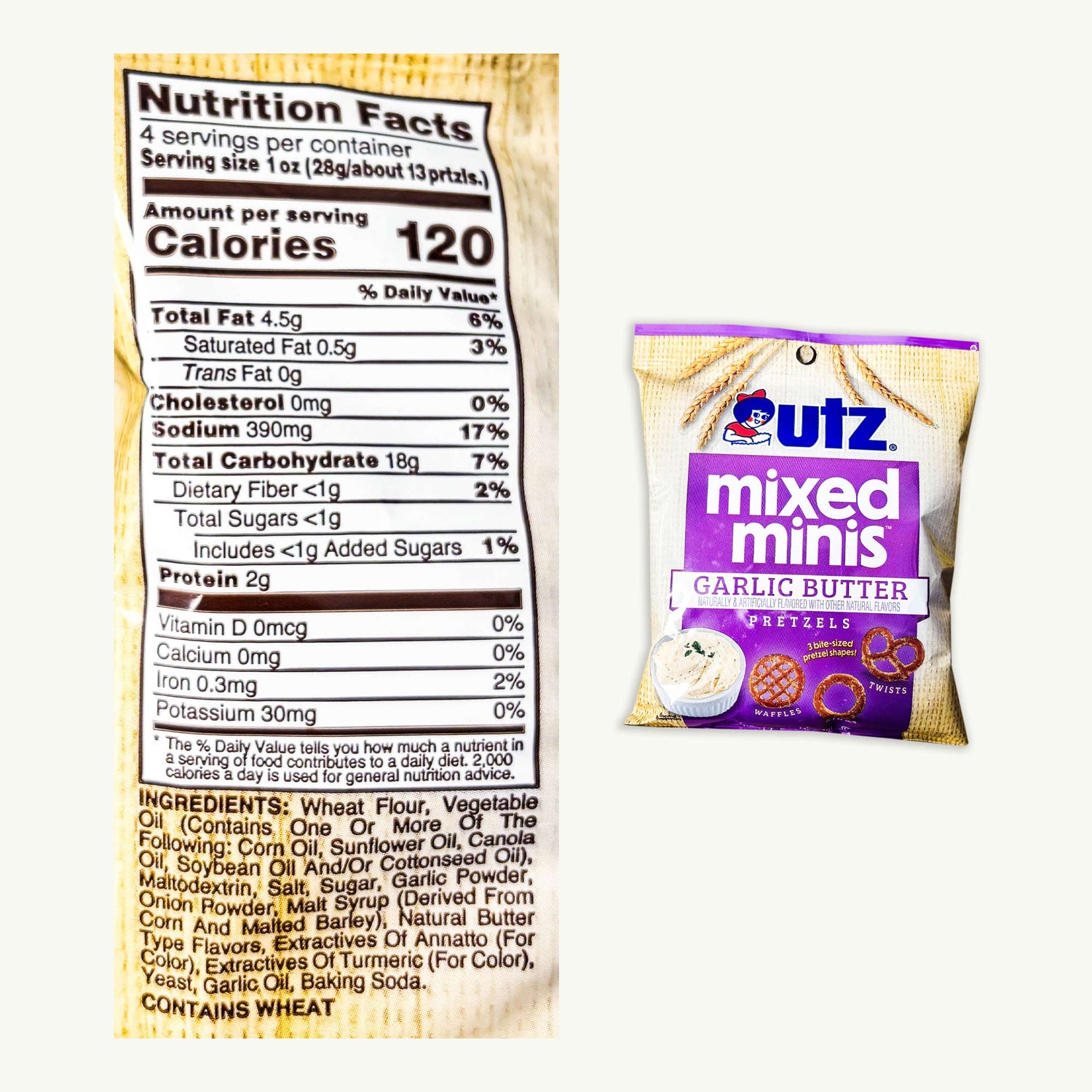 A savory twist on a classic snack—Utz Mixed Minis Garlic Butter Pretzels combine the rich flavors of garlic and butter with the satisfying crunch of bite-sized pretzels. This 4oz bag features an assortment of mini pretzel shapes, including twists, rings, and waffles, all seasoned to perfection. Whether you're enjoying them on the go or sharing with friends, these pretzels are sure to please.