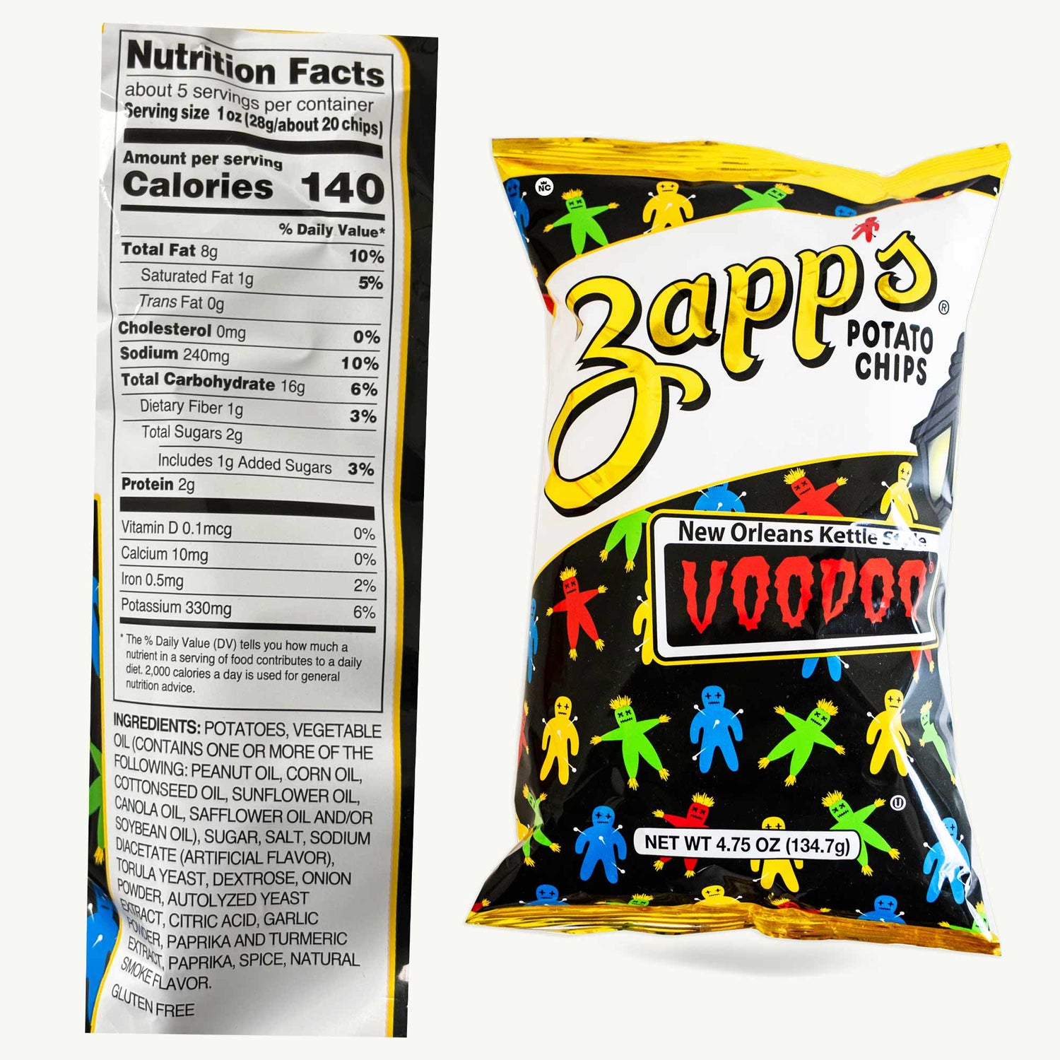 Experience bold flavor with Zapp's Voodoo New Orleans Kettle Potato Chips. This 4.75oz bag offers crispy kettle-cooked chips with a unique blend of tangy, smoky, and spicy seasonings inspired by New Orleans.